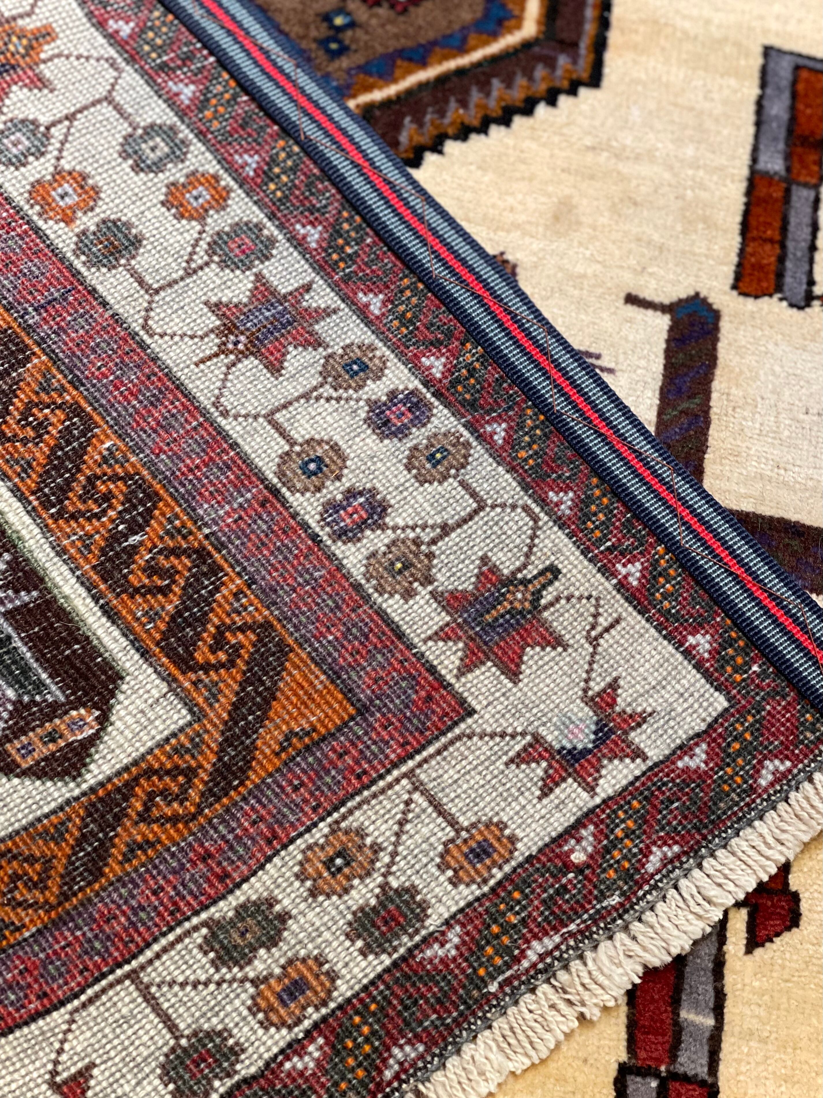 バルーチ族の絨毯は個性的な印象ですが、西イランの部族絨毯やキリムはもちろん、都市で織られた正統派のペルシャ絨毯にも良く合い、インテリアを選ばない不思議な魅力がある絨毯です。織り上がりは1cm程度でそれほど分厚くはありませんが、しっかりとしており織り目が詰まった絨毯です。