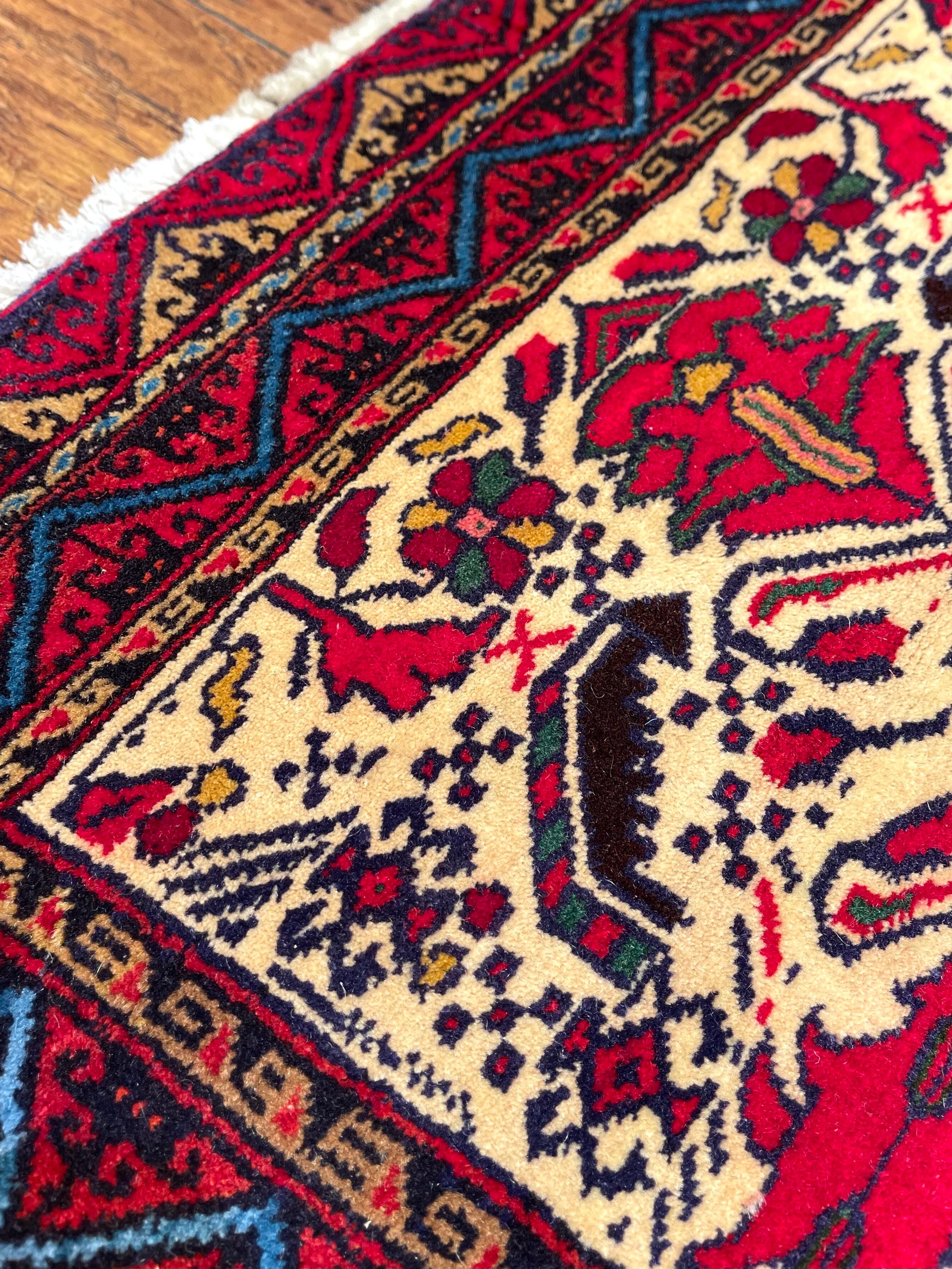 バルーチ族の絨毯は個性的な印象ですが、西イランの部族絨毯やキリムはもちろん、都市で織られた正統派のペルシャ絨毯にも良く合い、インテリアを選ばない不思議な魅力がある絨毯です。織り上がりは1cm程度でそれほど分厚くはありませんが、しっかりとしており織り目が詰まった絨毯です。