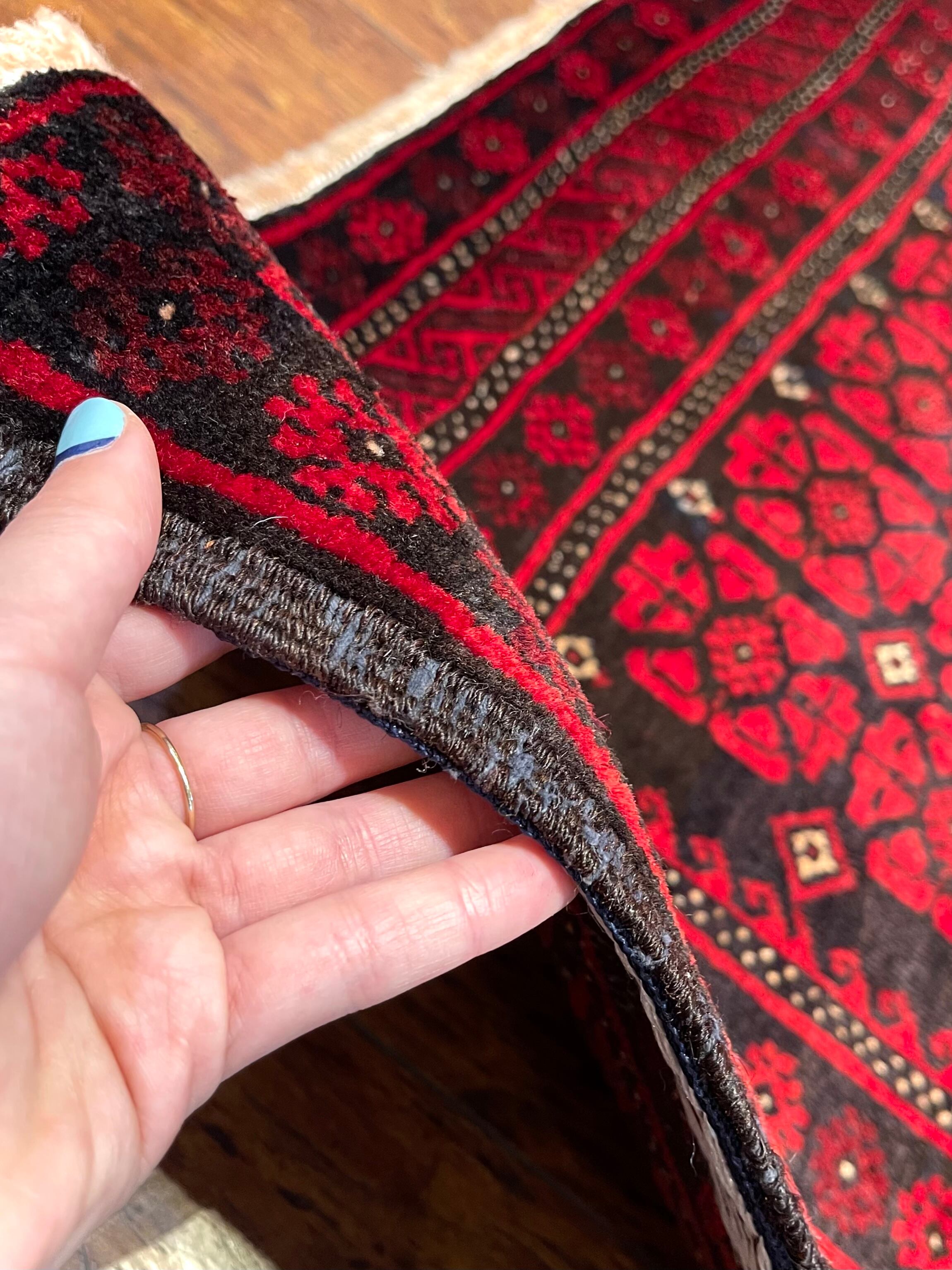 バルーチ族の絨毯は個性的な印象ですが、西イランの部族絨毯やキリムはもちろん、都市で織られた正統派のペルシャ絨毯にも良く合い、インテリアを選ばない不思議な魅力がある絨毯です。織り上がりは1cm程度でそれほど分厚くはありませんが、しっかりとしており織り目が詰まった絨毯です。
