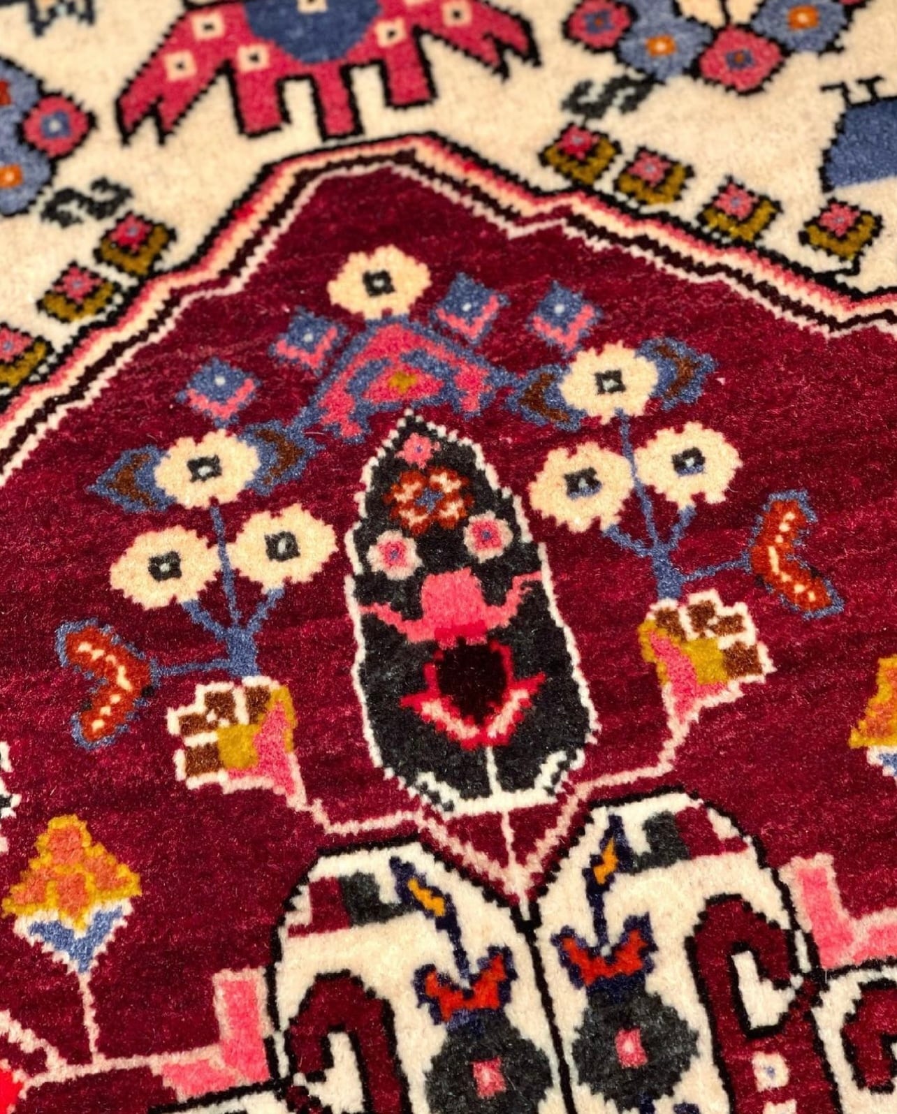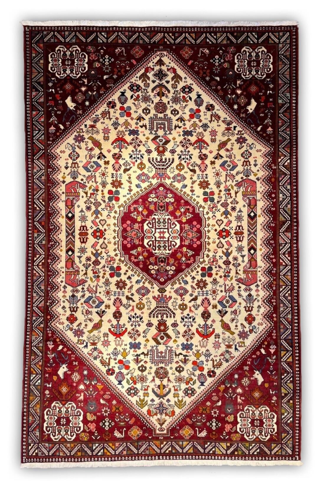 南イランのアバデで織られる絨毯は、菱形で区切られており、絨毯の中心と四隅の合わせて5つのメダリオンで構成される「へバトゥル」と呼ばれるデザインが主流です。基調部分を鳥や馬などといった動物や星、花・樹木などの紋様が隙間なく埋め尽くしています。この地域は遊牧をやめて定住したカシュガイ族の人々が多く暮らすことから、こうした紋様からはギャッベにも共通するようなものが多く見られることも特徴です。