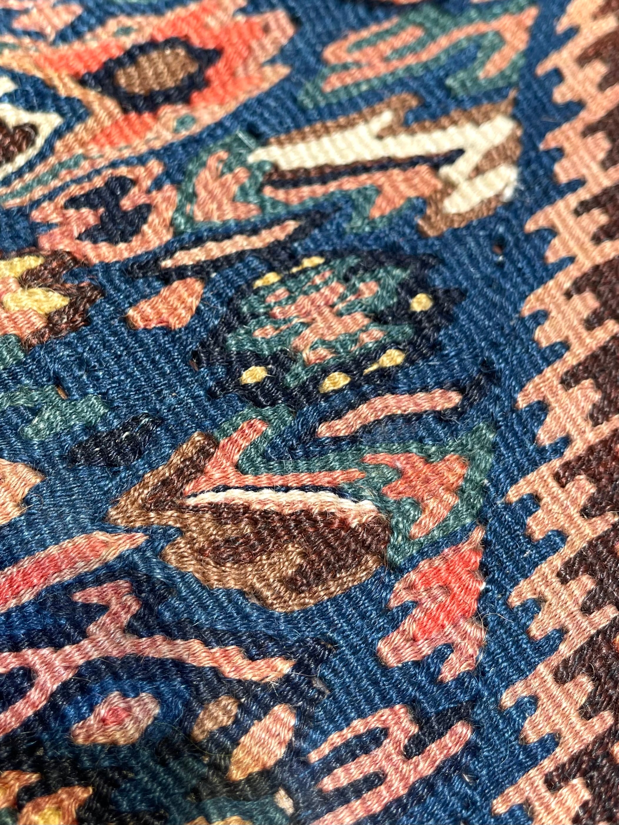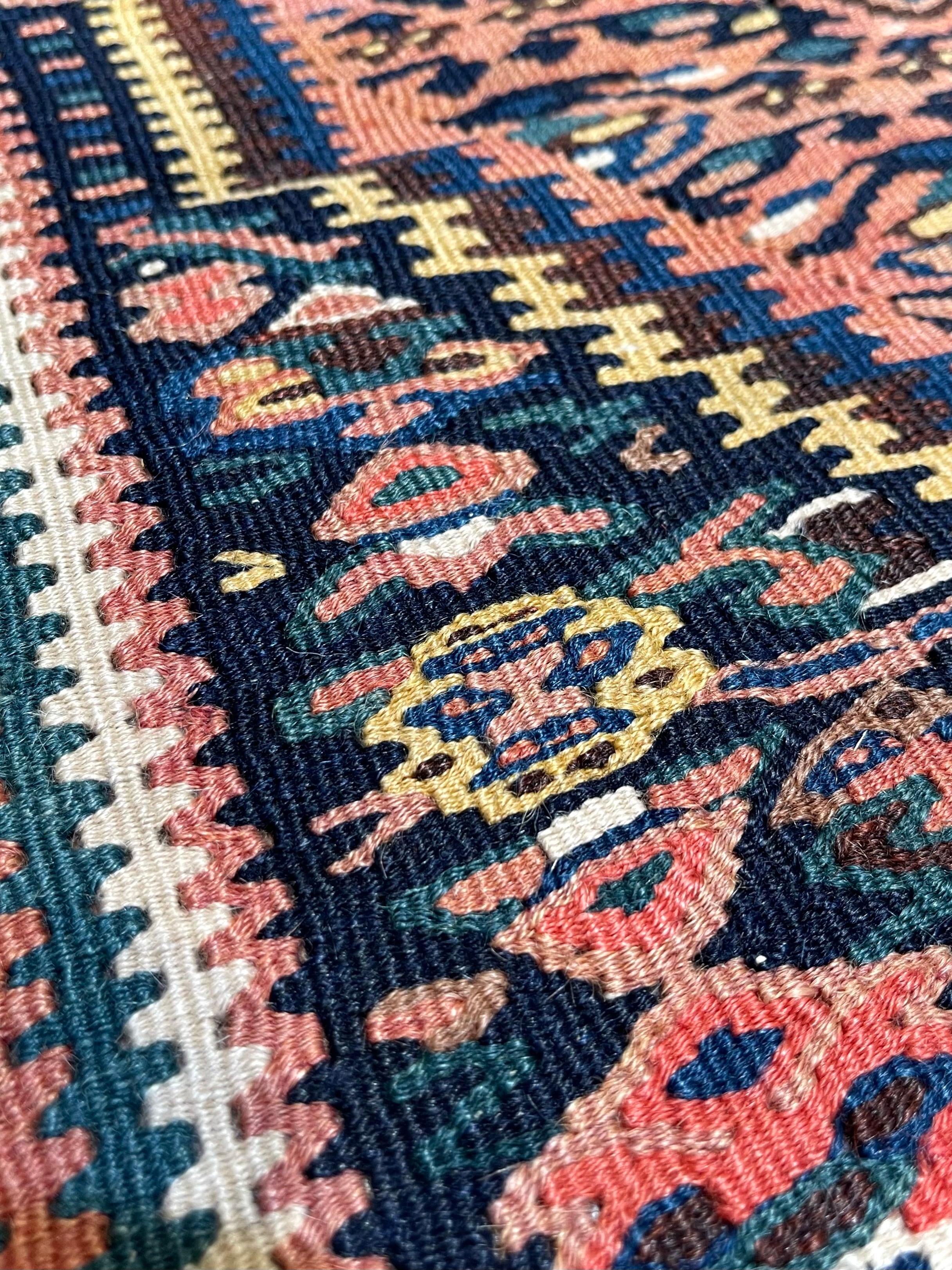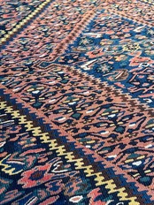 上質なウールを使用した織りの細かいキリムのため薄い織り上がりです。厚みはないものの床の冷たさを感じさせず、また暑い季節でもさらっとしたお使い心地でオールシーズン活躍します。お玄関マットとして、ベッドサイドや洗いやすいのでキッチンマットにもおススメです。軽量のため、画鋲などで壁に留めることができ、気軽にタペストリーとしてもお楽しみ頂けます。