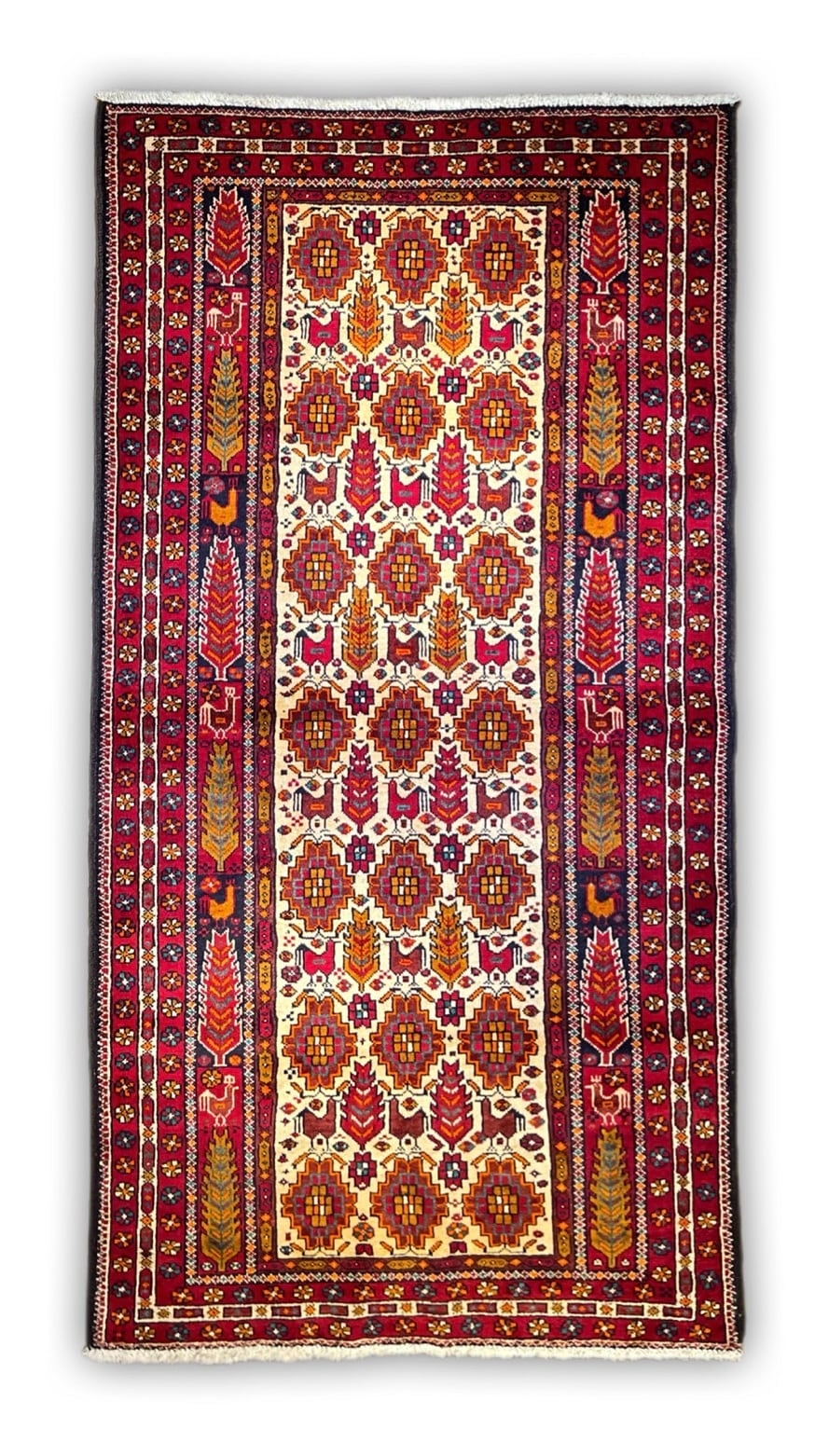 バルーチ族は東イラン、アフガニスタン、パキスタンに渡り住んでいる部族ですが、絨毯を織っているのは東イランと西アフガニスタンにいるバルーチ族だと言われています。バルーチ族の絨毯は重厚な色合いのものが多く、東洋的で渋い印象ですが、実は幾何学紋様へと姿を変えた動物柄が多く含まれています。