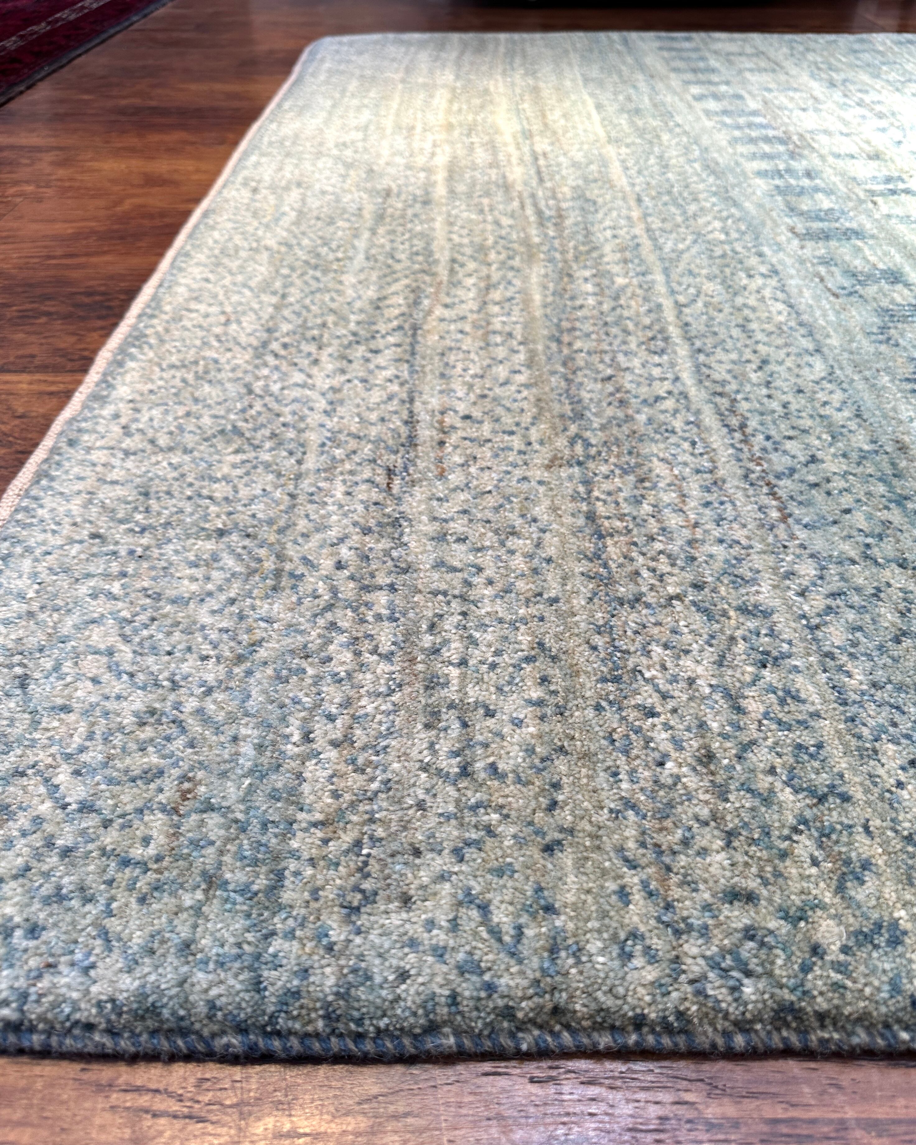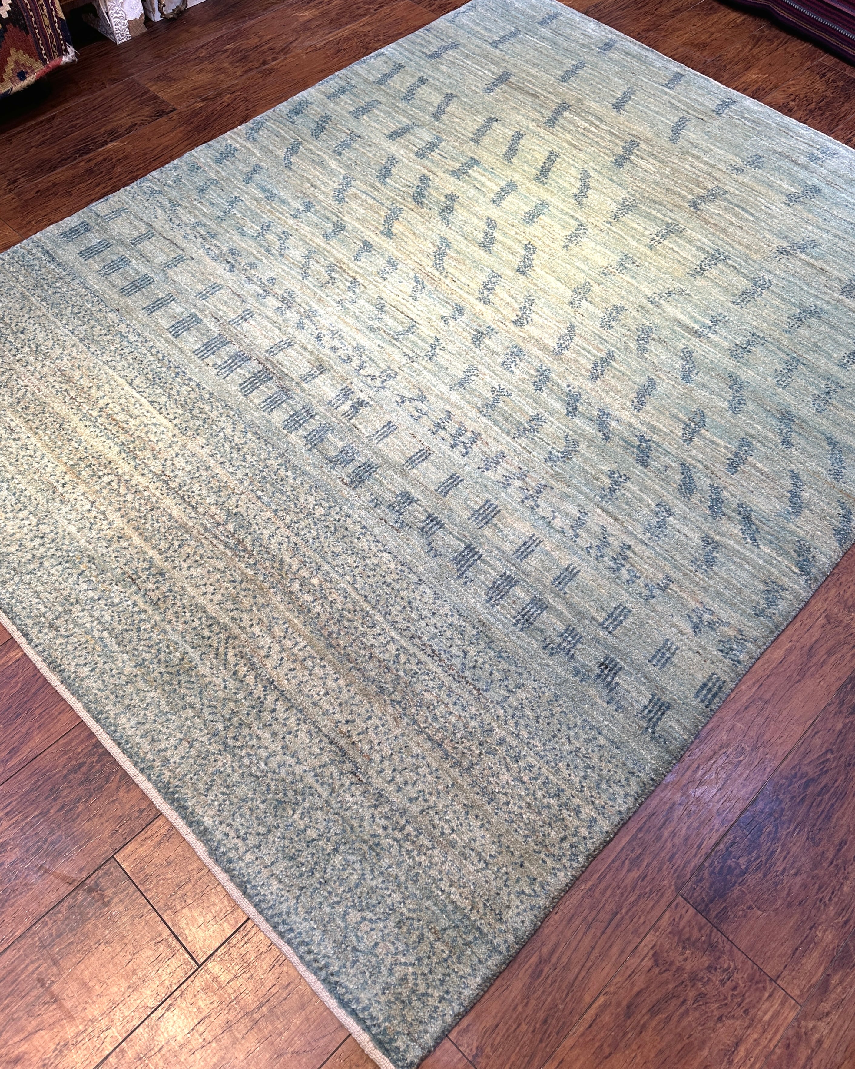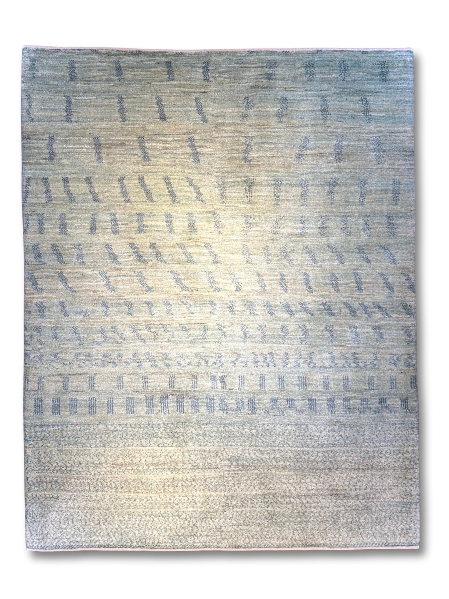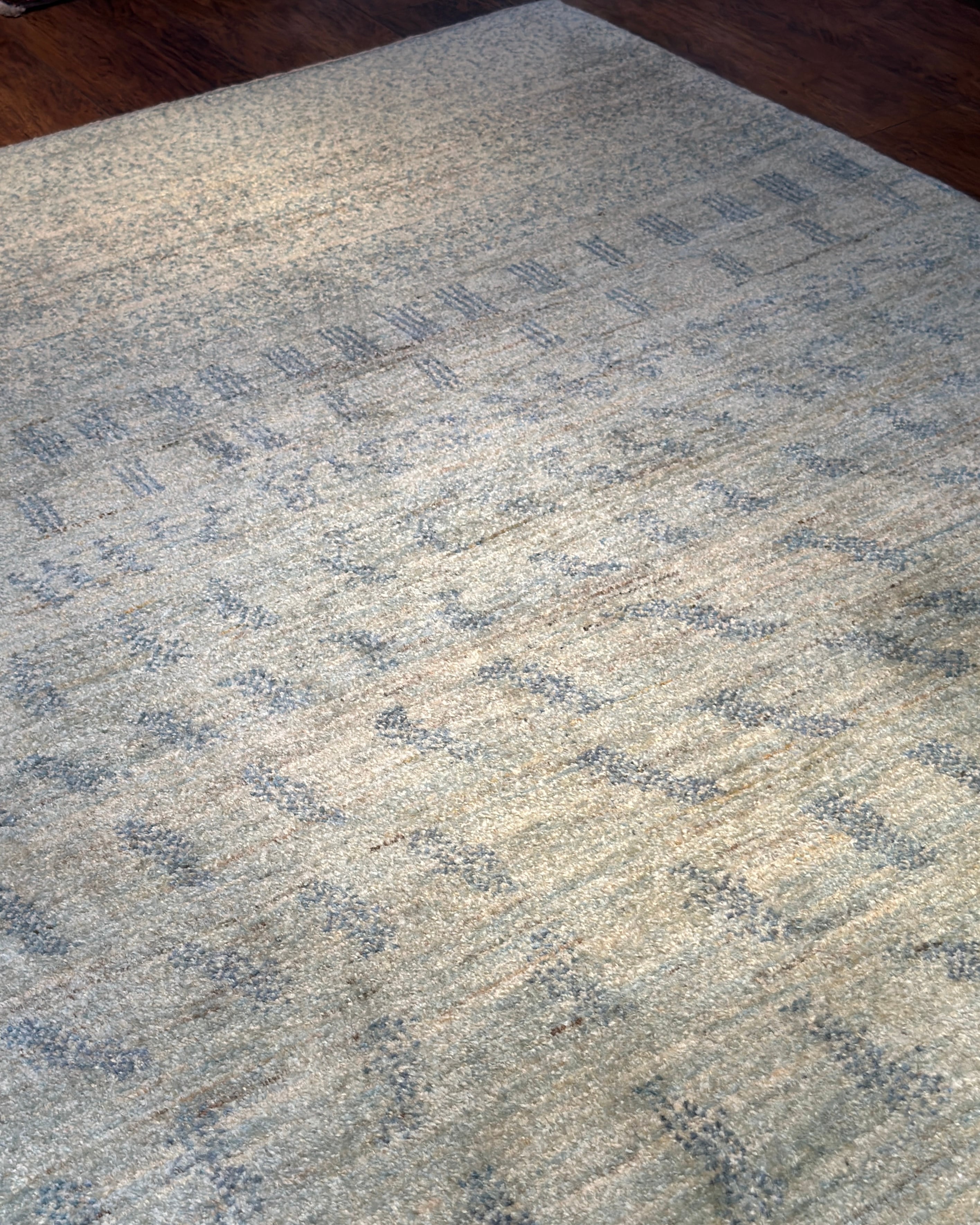 絶妙な水色の中間色のギャッベです。ありそうでない、透き通った水色の大変珍しいカラーです。ニュアンス使いもして頂き易く、明るい床の上でもトーンを落とさずに、コーディネートして頂けます。