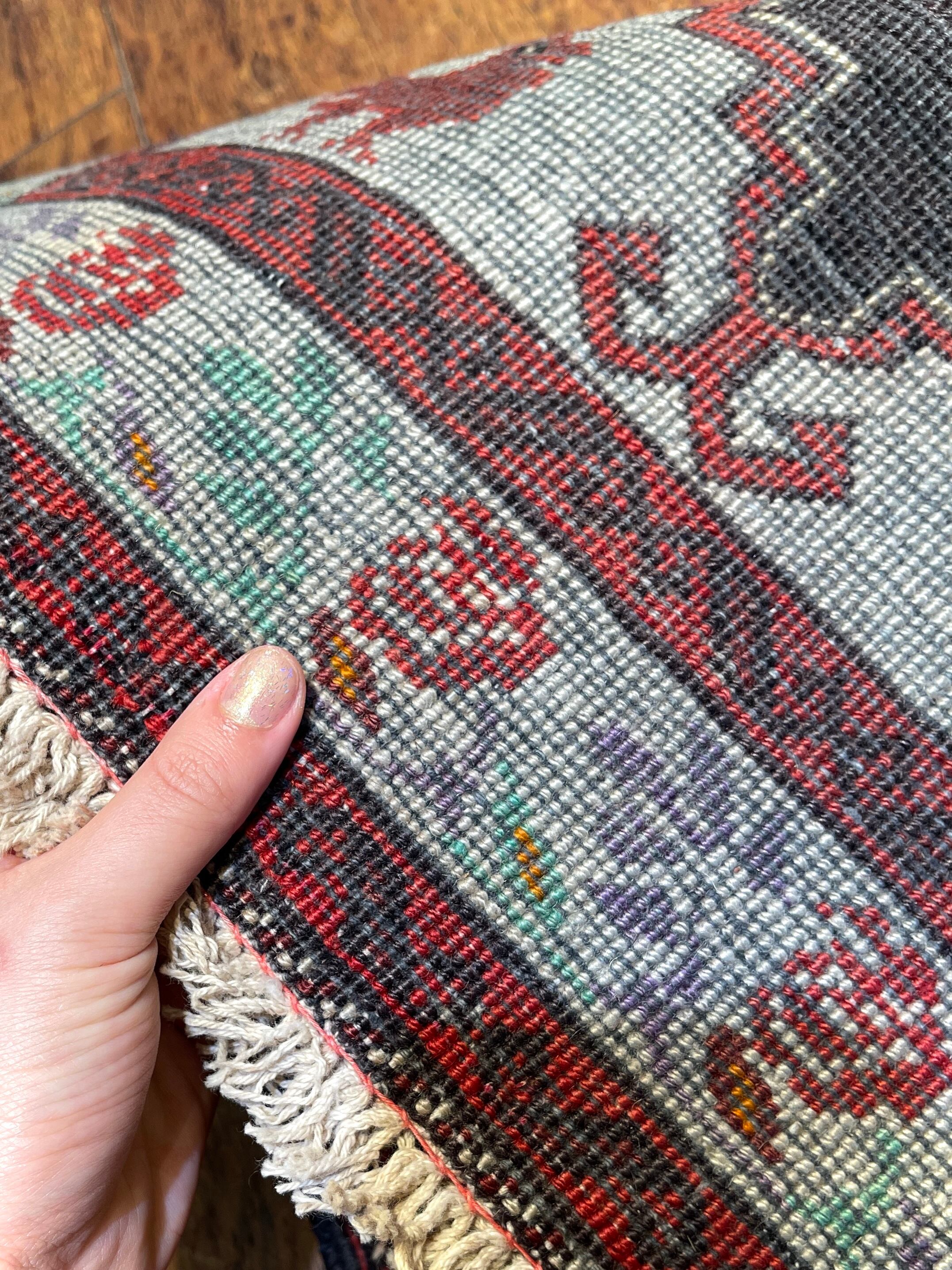 バルーチ族の絨毯は個性的な印象ですが、西イランの部族絨毯やキリムはもちろん、都市で織られた正統派のペルシャ絨毯にも良く合い、インテリアを選ばない不思議な魅力がある絨毯です。織り上がりは1cm程度でそれほど分厚くはありませんが、しっかりとしており織り目が詰まった絨毯です。