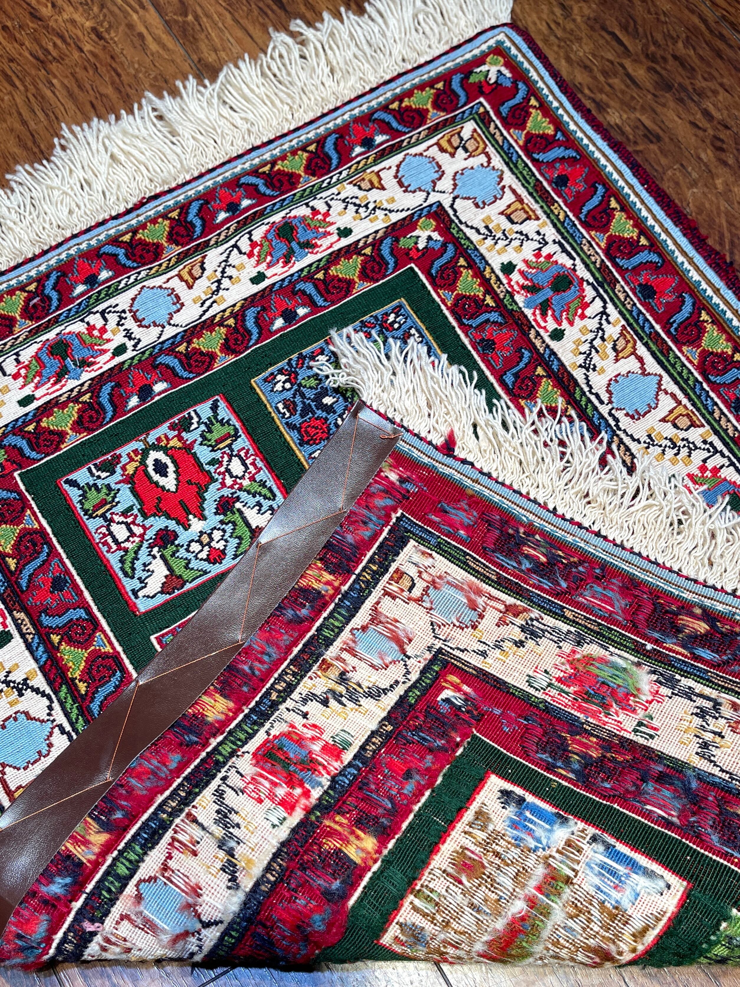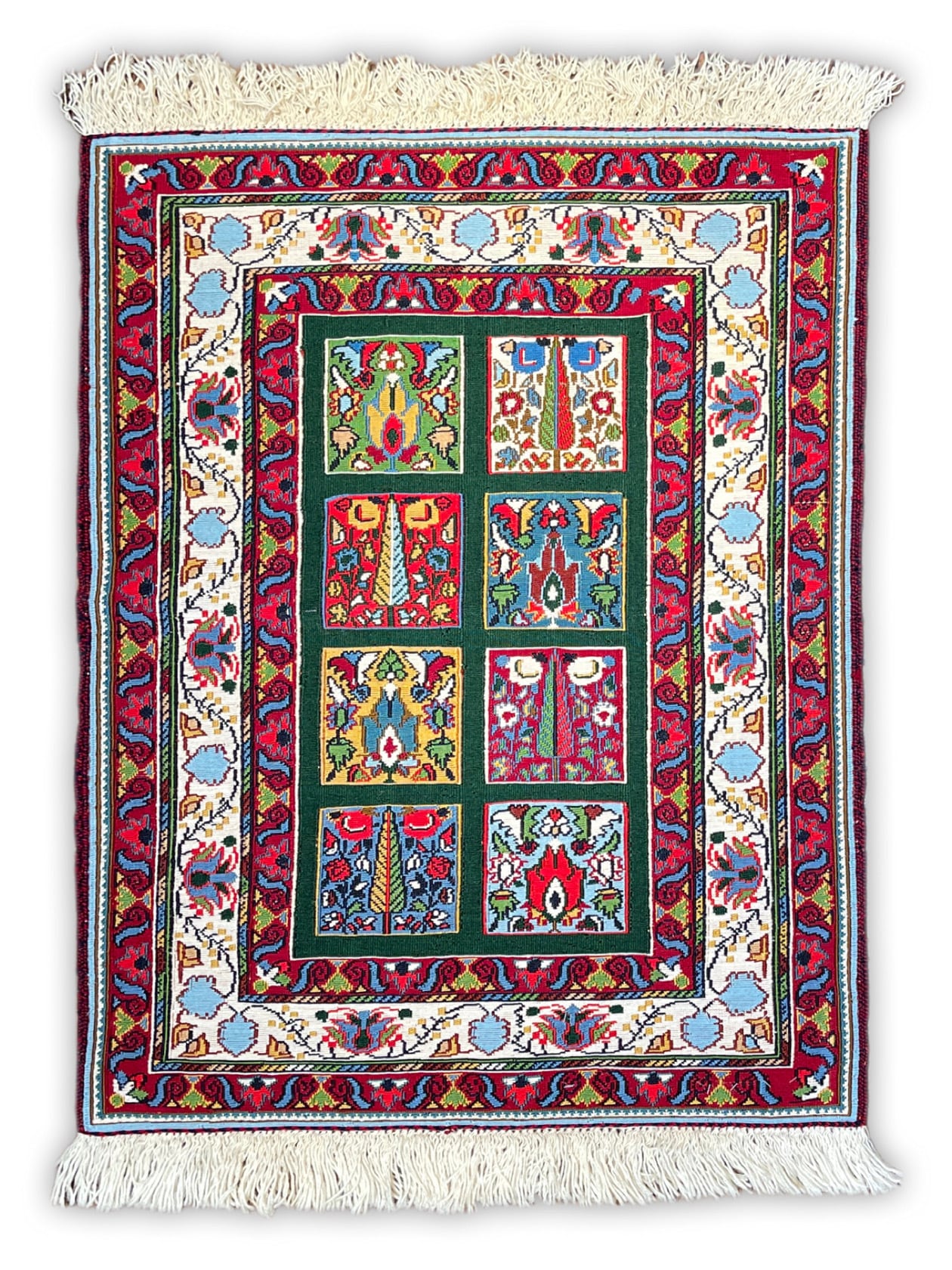 基本、絨毯として織られるこちらのデザインですが、平織りでも綺麗に曲線が表現されているのは、シルジャン特有のソマック織りという複雑な技法ならではです。