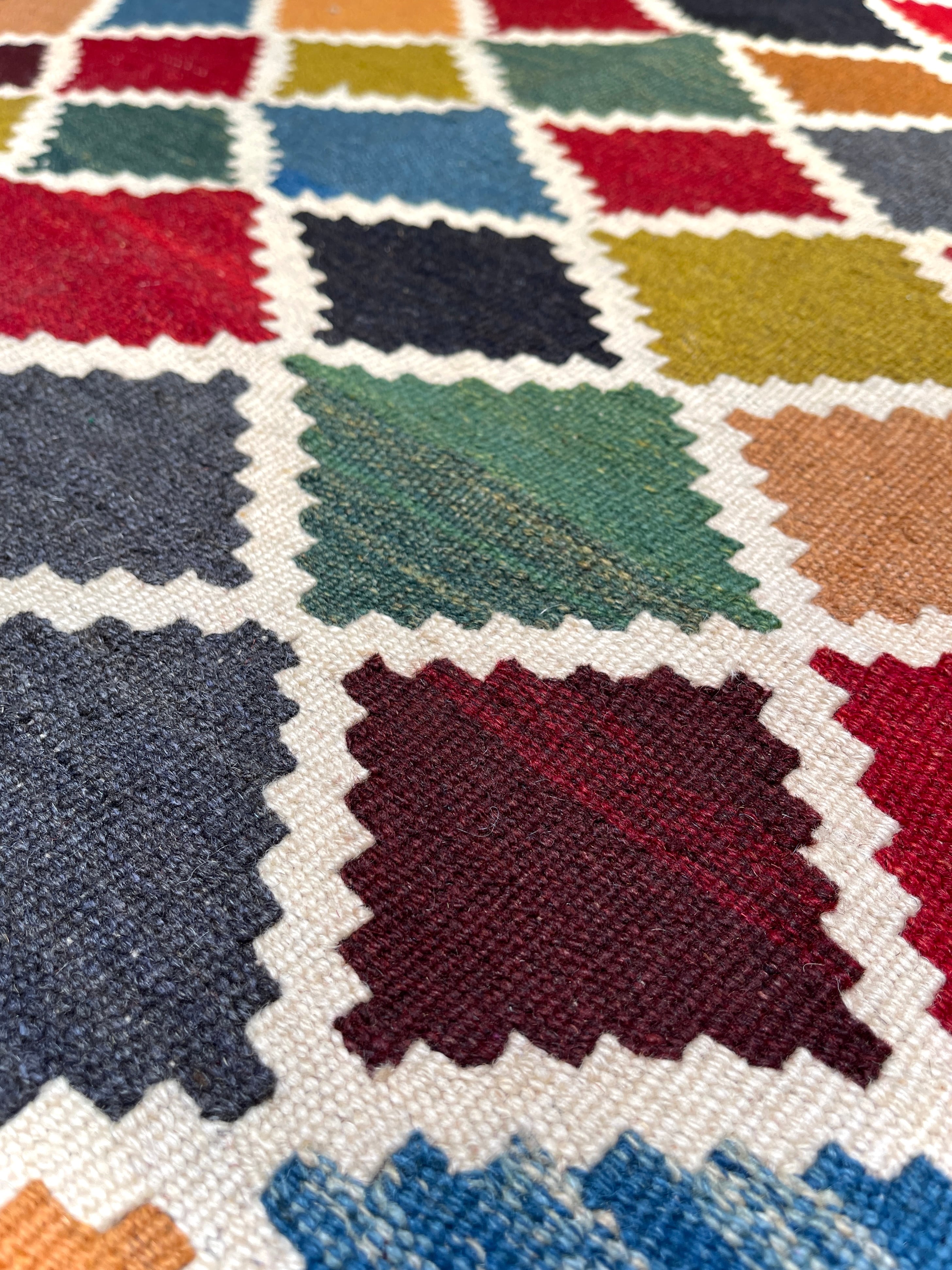 薄い織り上がりのキリムですが、ウールで織られているので、床の冷たさを感じさせず、また暑い季節でもスッキリとしたお使い心地で、オールシーズン活躍します。