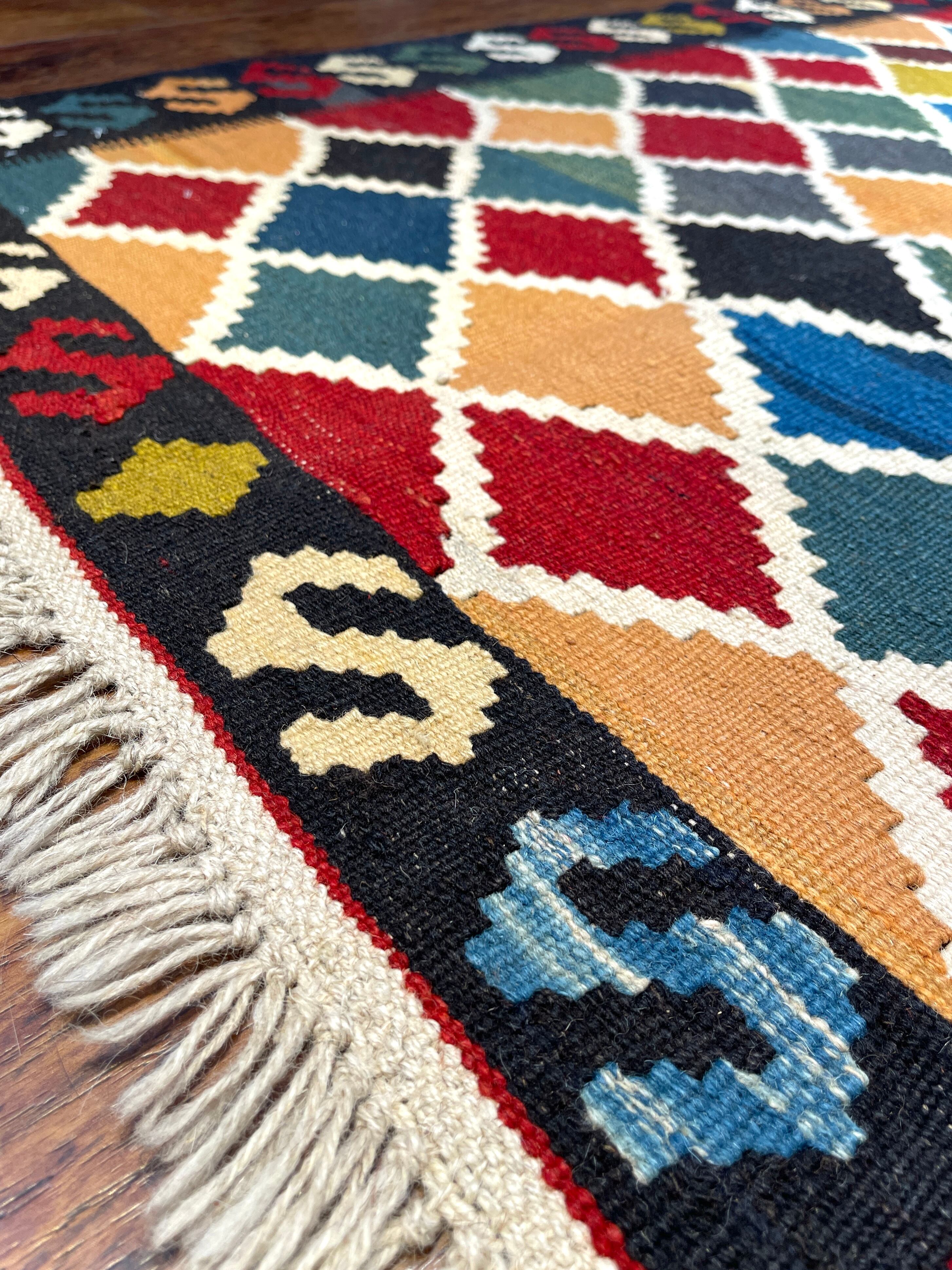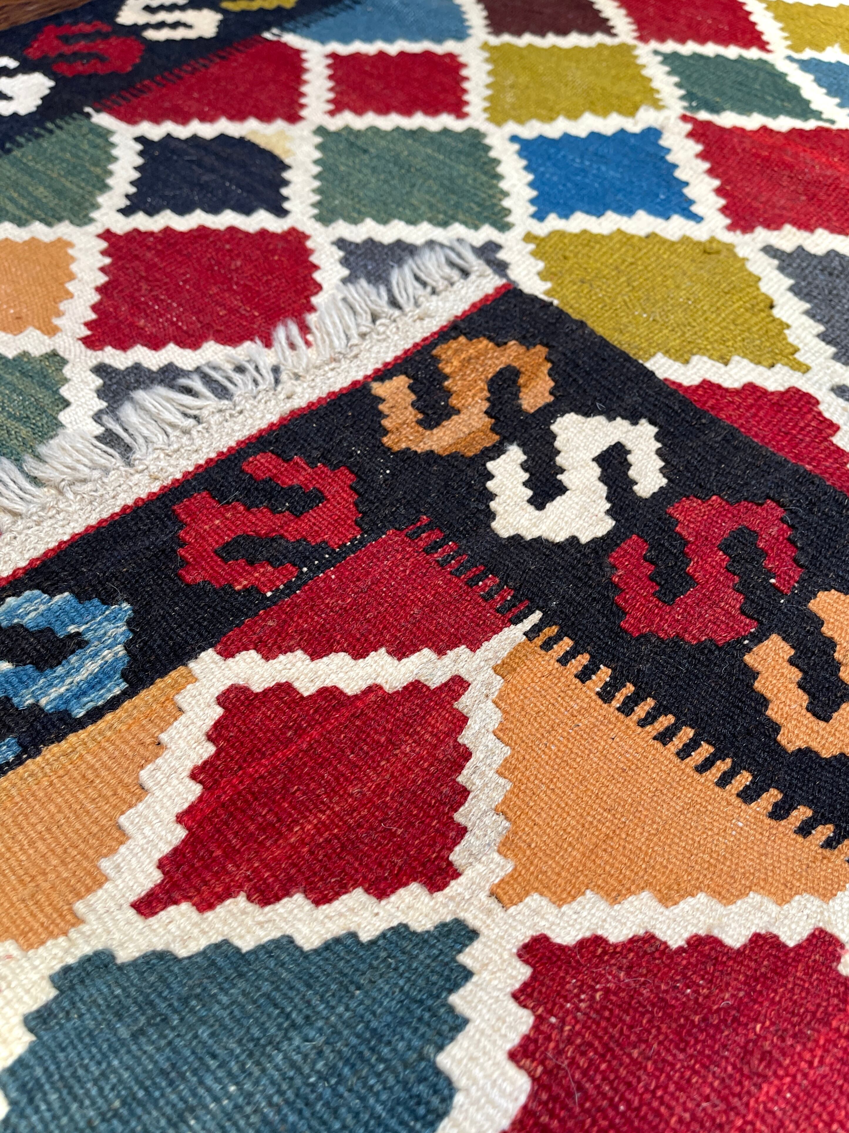 南西イラン・シーラーズ近郊で遊牧生活を営んできたことで知られる、カシュガイ族のキリムです。