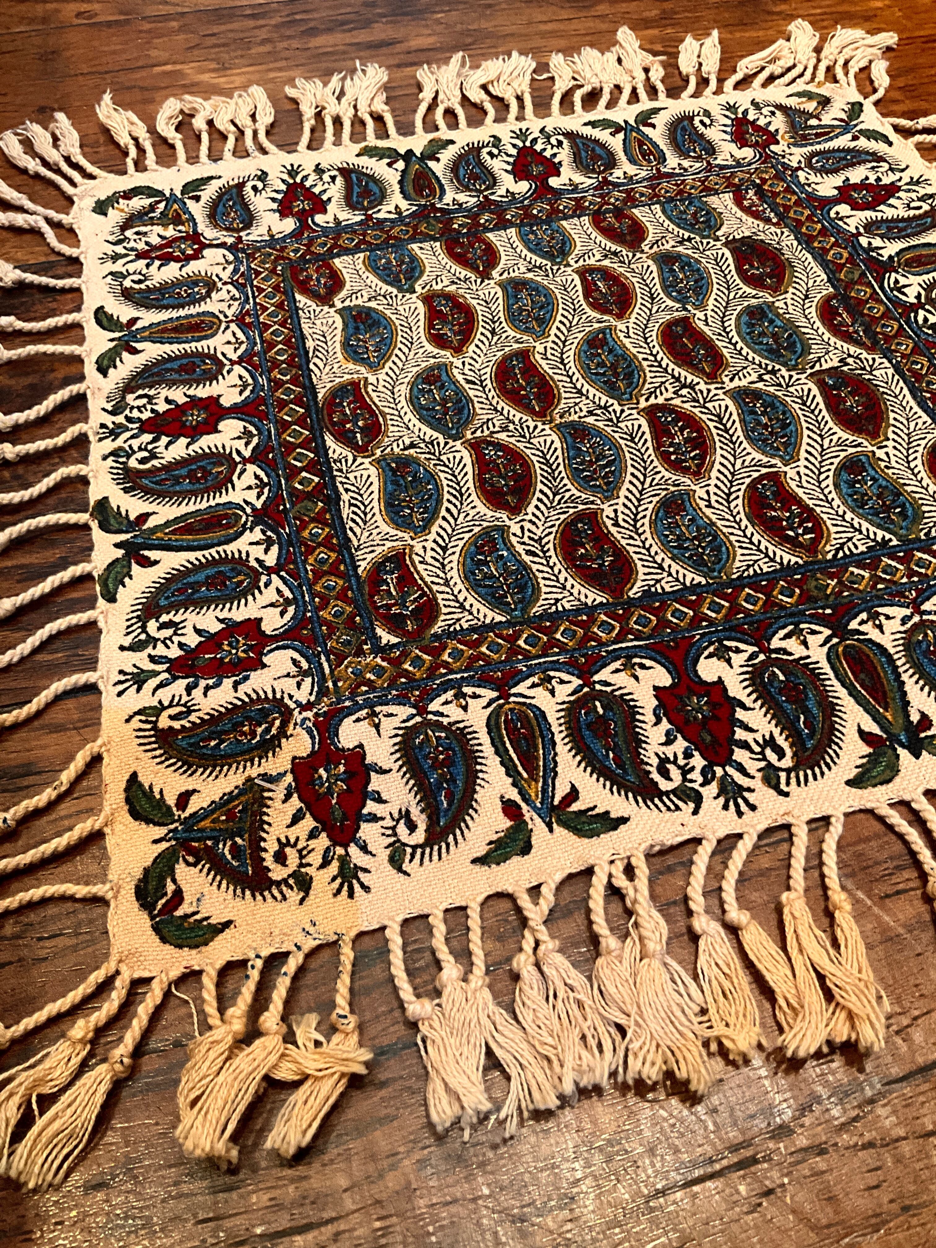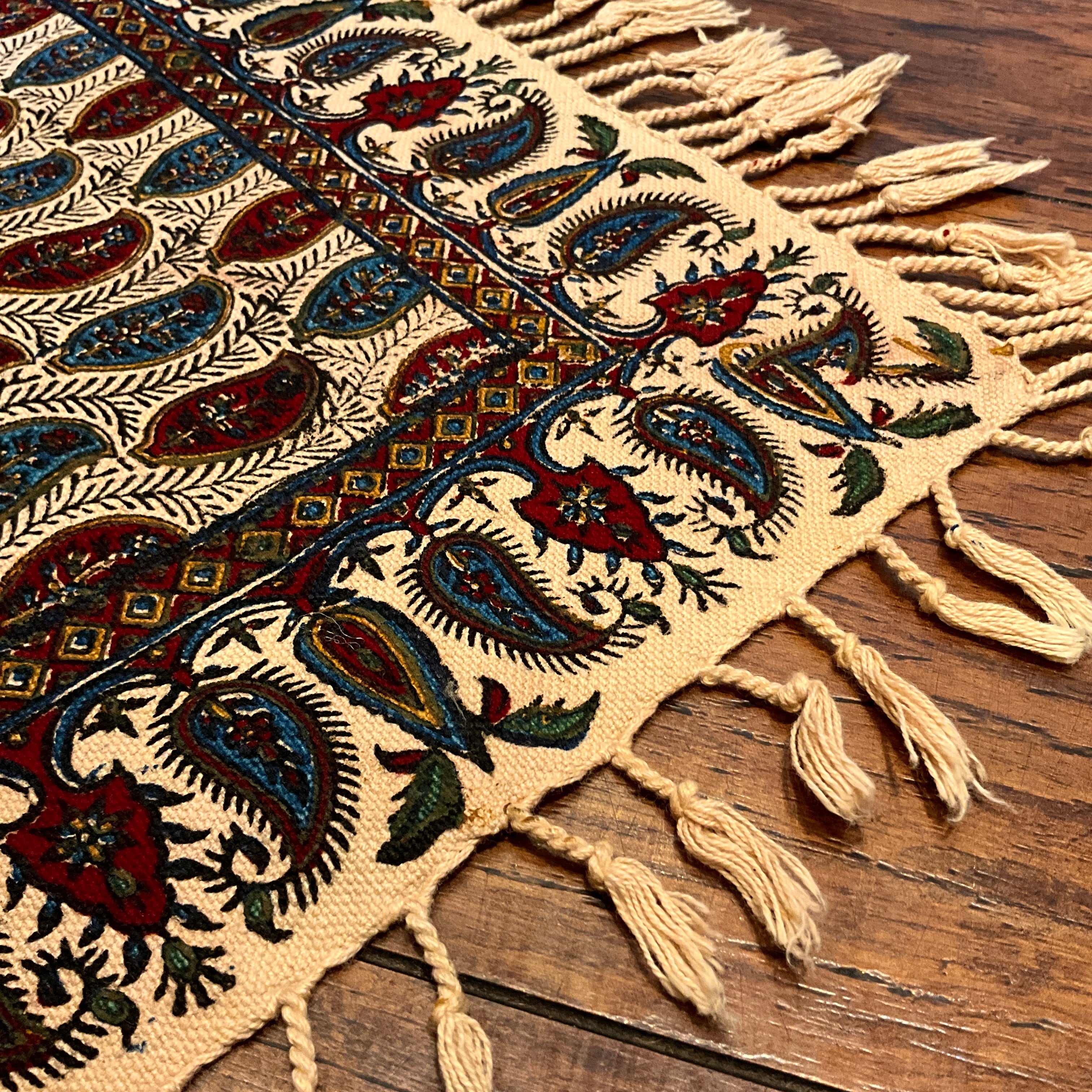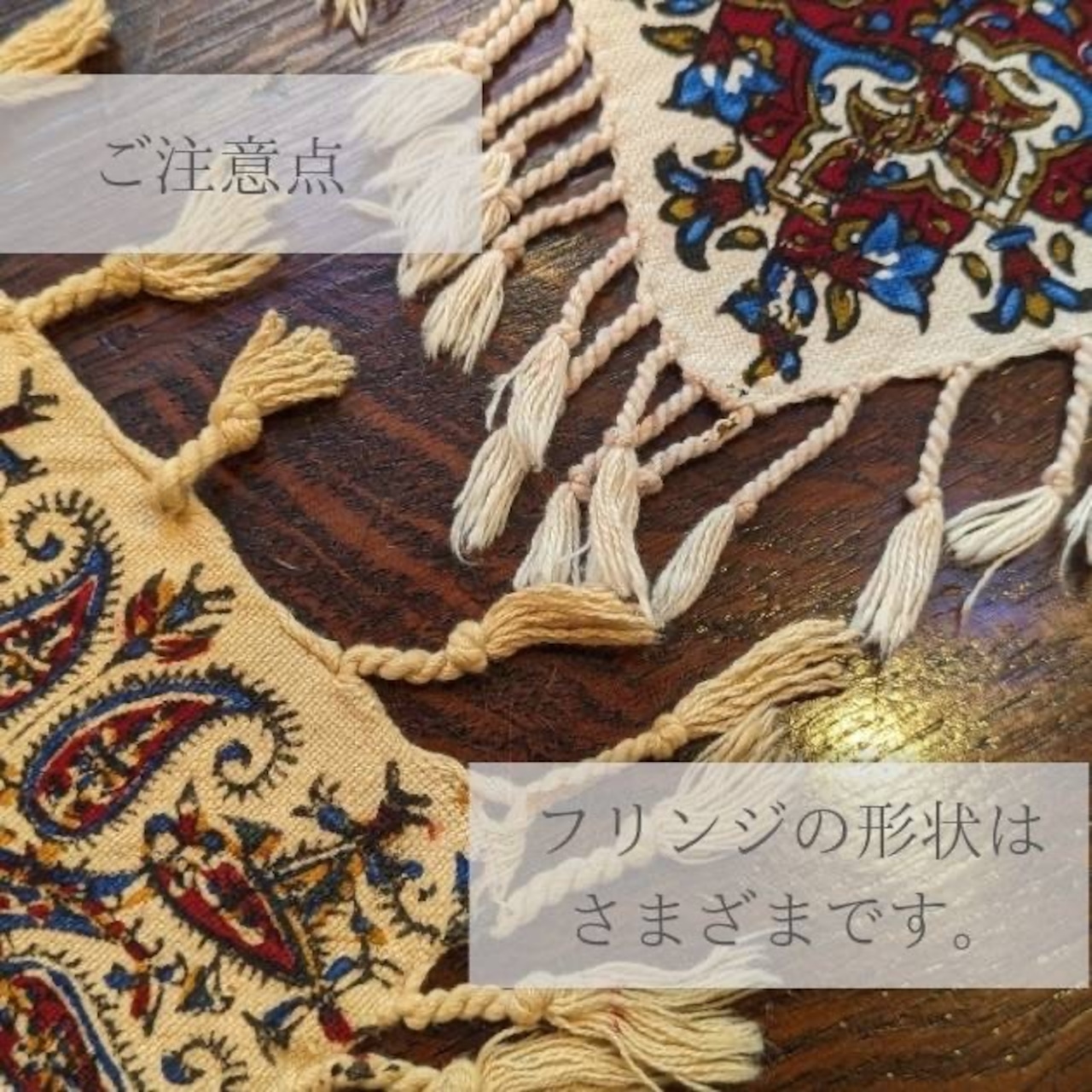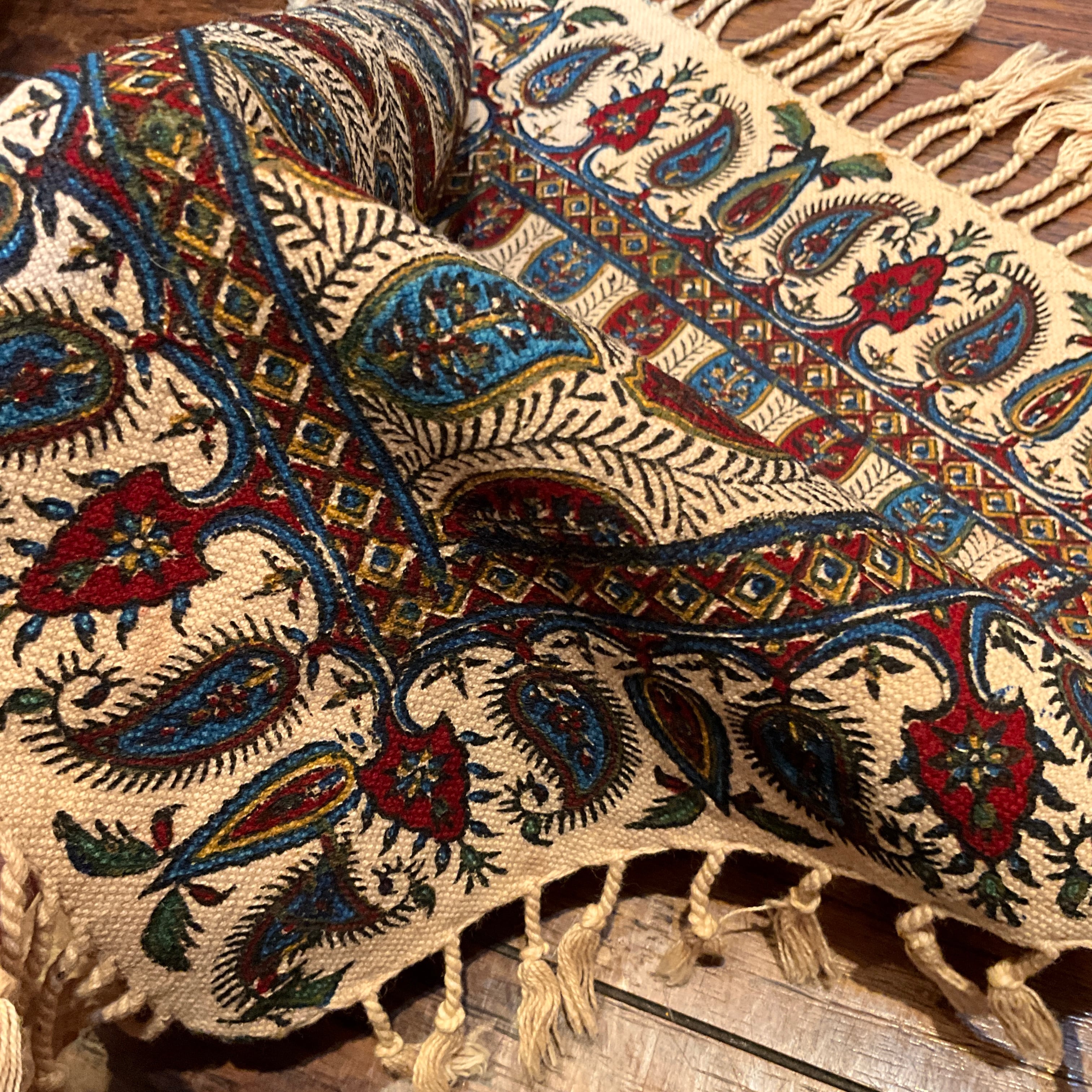 ペルシャ更紗は、イランの古都イスファハンで、伝統的な手法で作られているハンドプリントの手工芸品です。ペルシャ語では「ガラムカーリ」と呼ばれます。更紗職人により、梨の木を繰り抜いて作られた木判で、押し染めを繰り返してデザインを作っていきます。紋様を一つ完成させるのにも、異なる型判や色を塗り替えて押すので、紋様が出来上がるまでには4〜5回もの作業を必要とします。