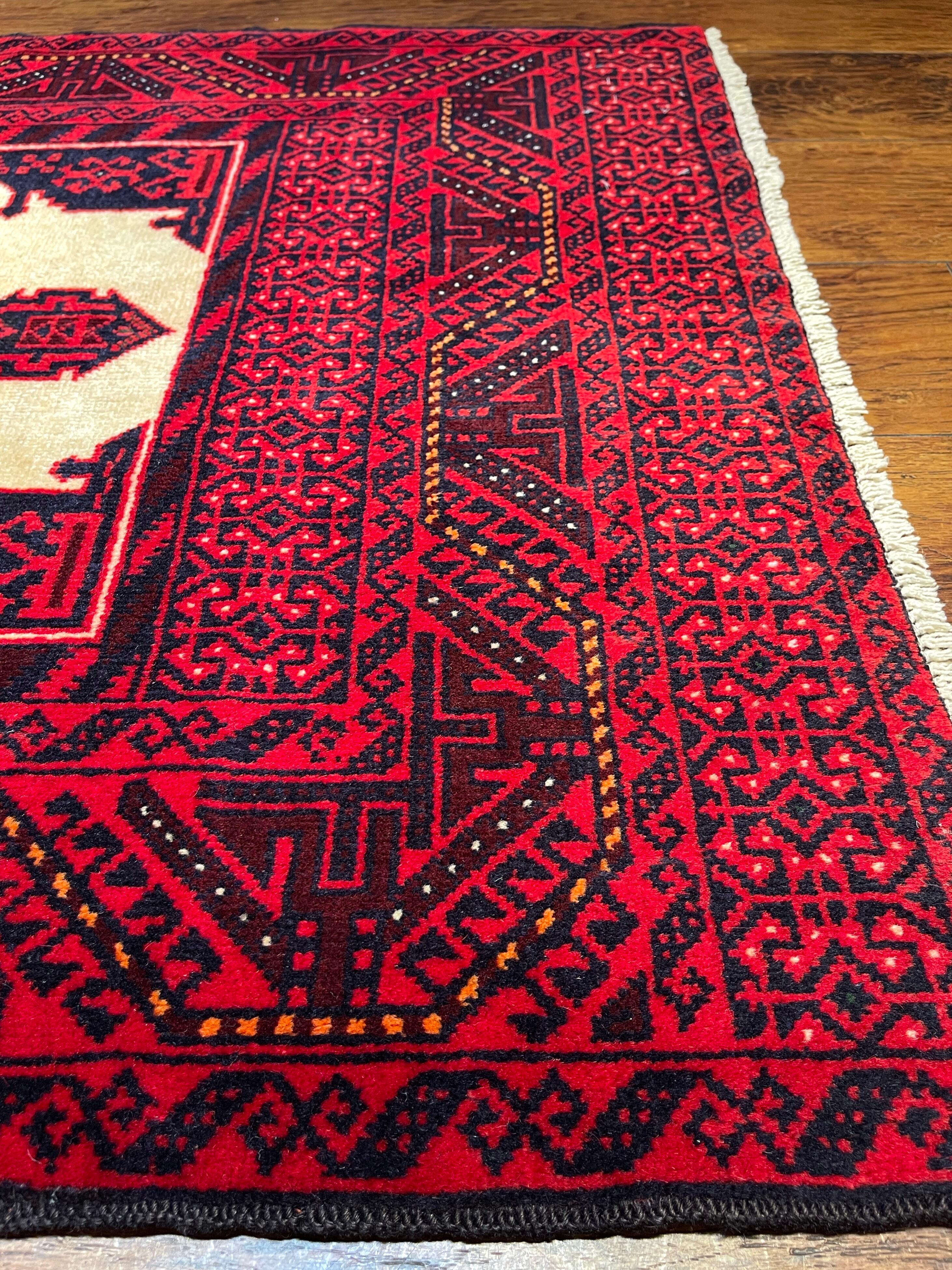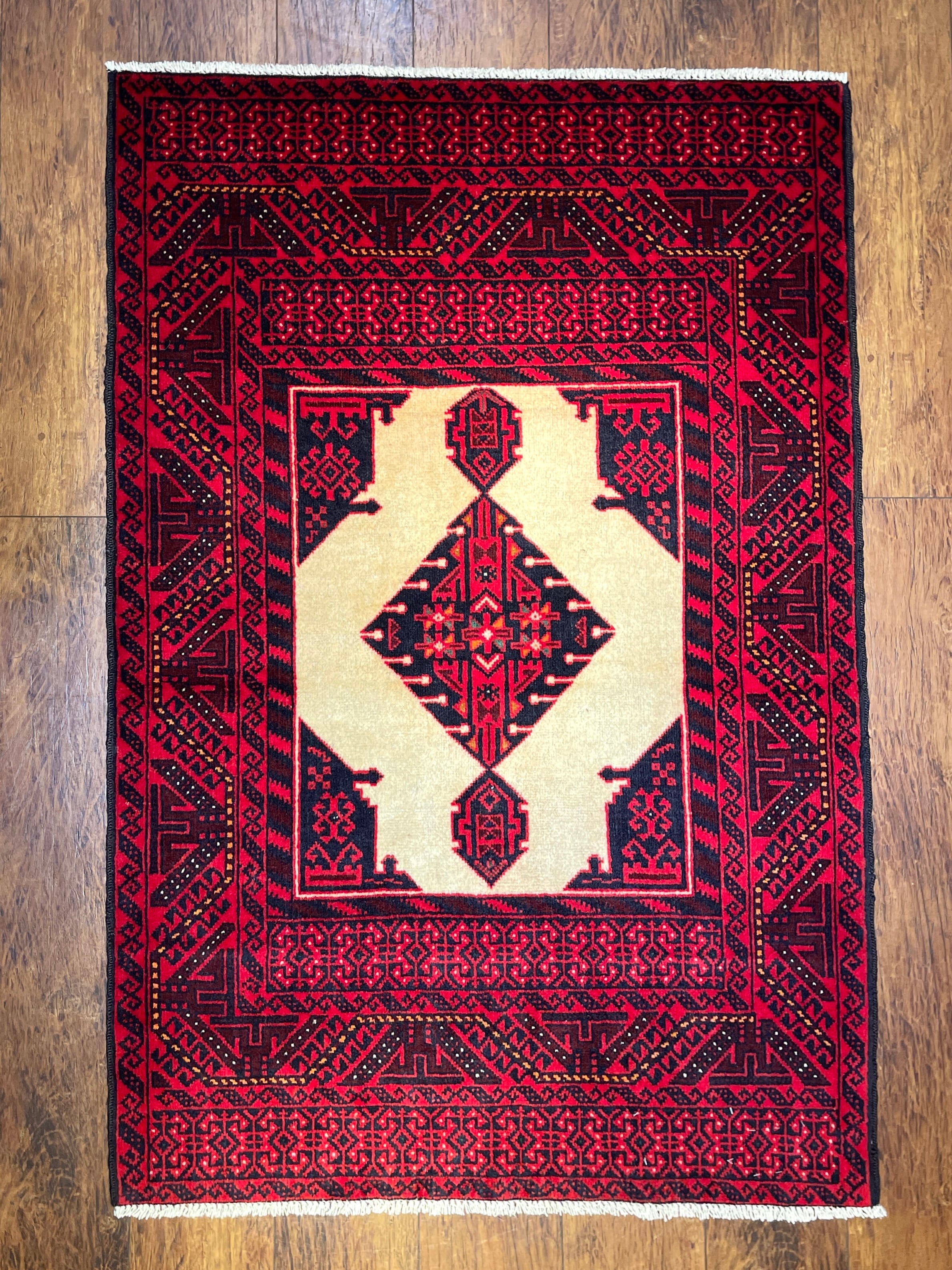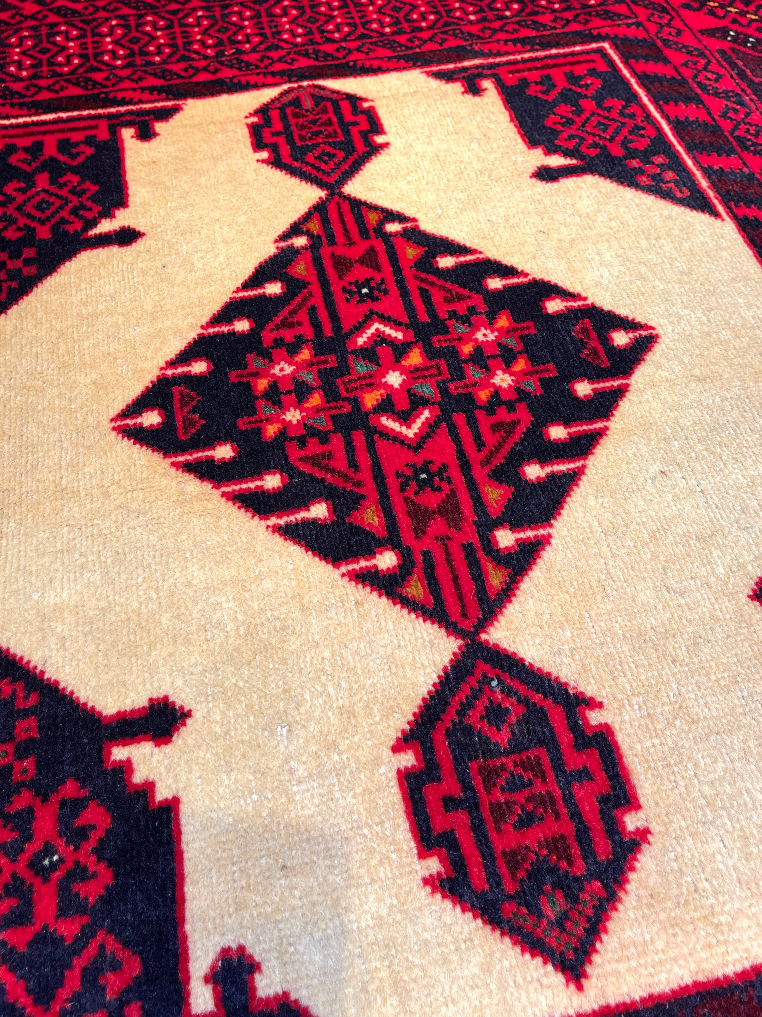 バルーチ族は東イラン、アフガニスタン、パキスタンに渡り住んでいる部族ですが、絨毯を織っているのは東イランと西アフガニスタンにいるバルーチ族だと言われています。バルーチ族の絨毯は重厚な色合いのものが多く、東洋的で渋い印象ですが、実は幾何学紋様へと姿を変えた動物柄が多く含まれています。