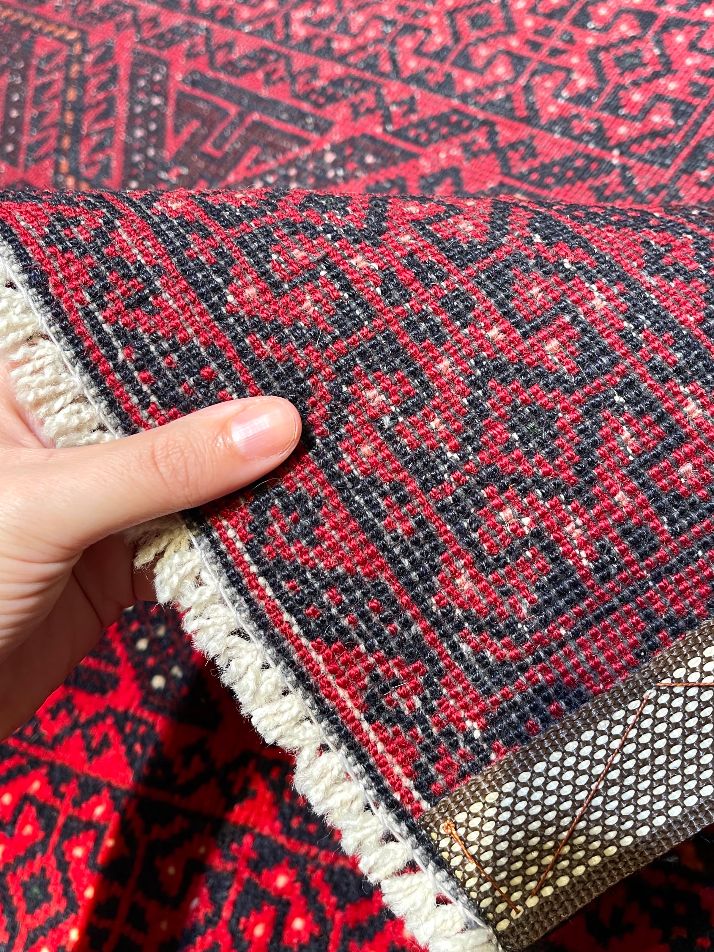 バルーチ族の絨毯は個性的な印象ですが、西イランの部族絨毯やキリムはもちろん、都市で織られた正統派のペルシャ絨毯にも良く合い、インテリアを選ばない不思議な魅力がある絨毯です。織り上がりは1cm程度でそれほど分厚くはありませんが、しっかりとしており織り目が詰まった絨毯です。