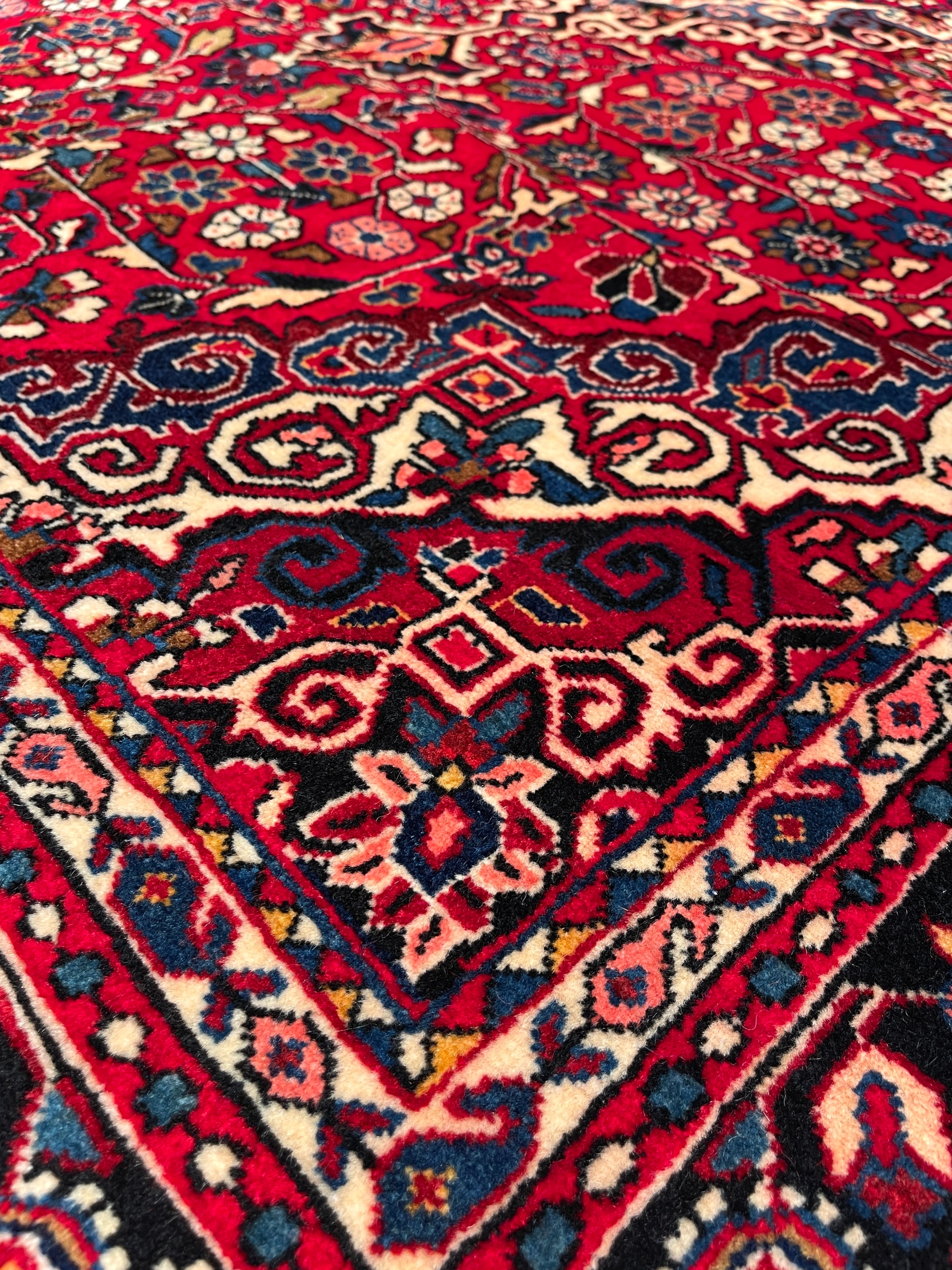 上質なウールで織られた、非常に目の詰まったジョーザンのオールド絨毯です。文字通り隅から隅まで、基調部分からフレームに渡るまでをぎっしりと埋め尽くす、花々のデザインが特徴的な産地です。これは、近隣のサルークと呼ばれる産地のデザインの影響を受けているとされています。