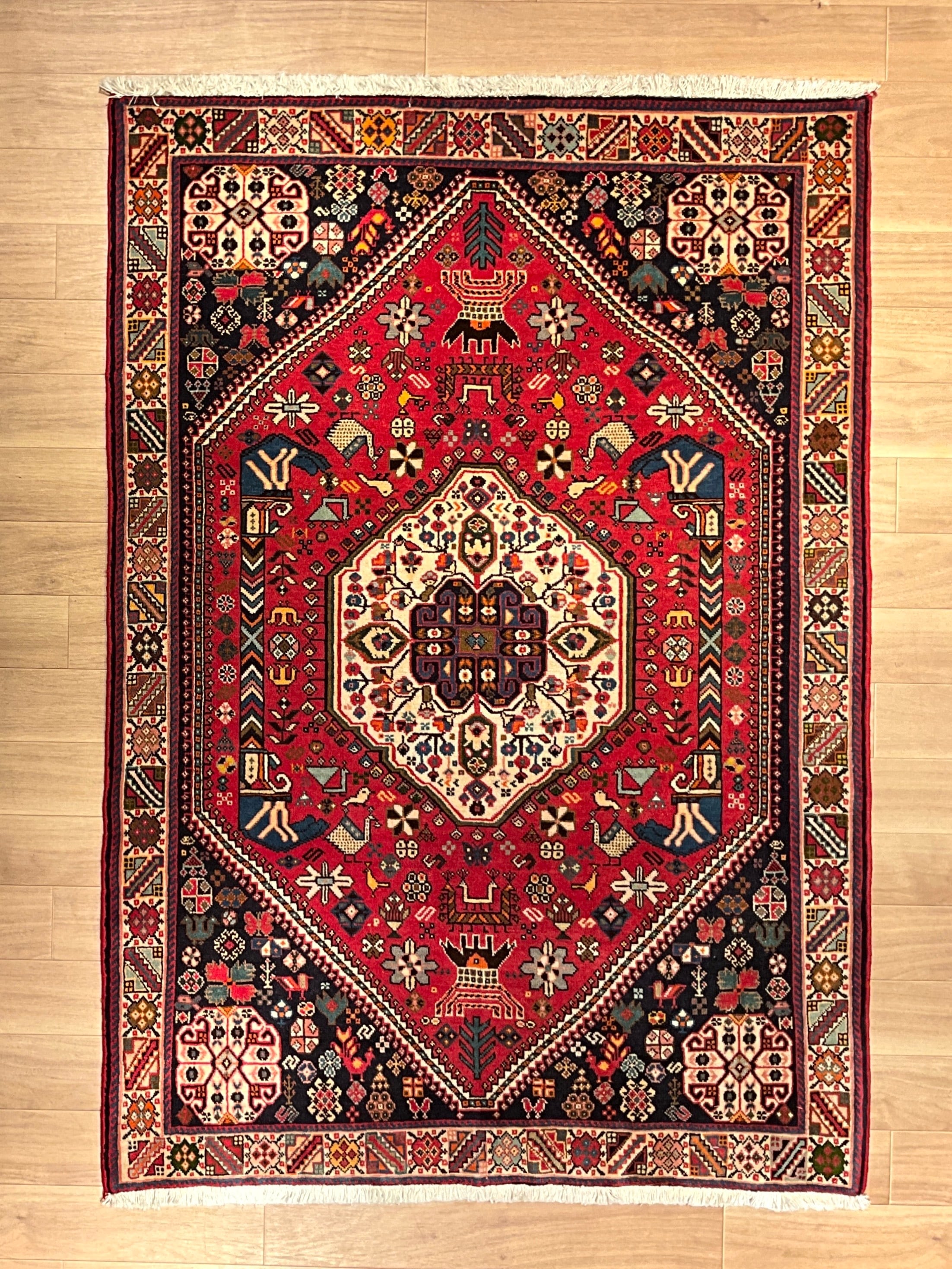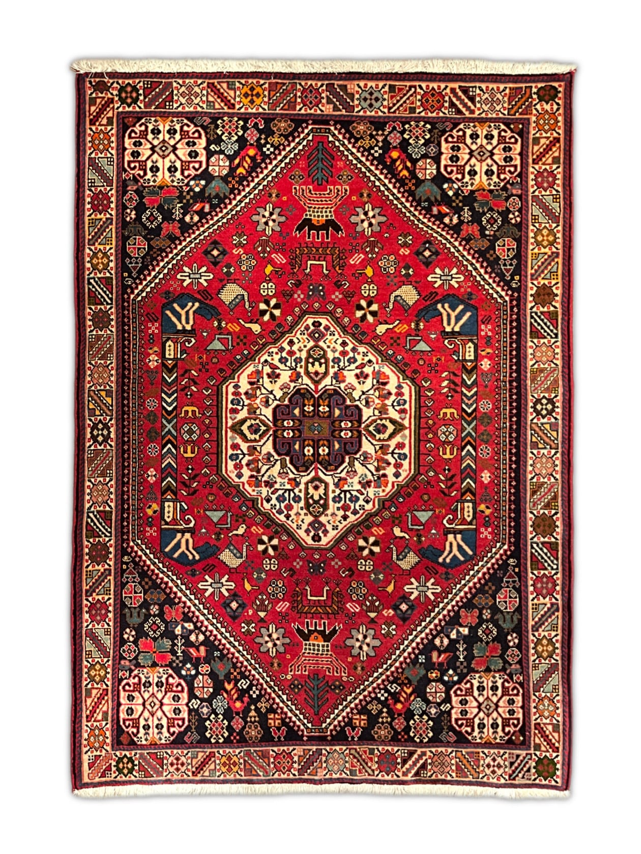 南イランのアバデで織られる絨毯は、菱形で区切られており、絨毯の中心と四隅の合わせて5つのメダリオンで構成される「へバトゥル」と呼ばれるデザインが主流です。基調部分を鳥や馬などといった動物や星、花・樹木などの紋様が隙間なく埋め尽くしています。この地域は遊牧をやめて定住したカシュガイ族の人々が多く暮らすことから、こうした紋様からはギャッベにも共通するようなものが多く見られることも特徴です。
