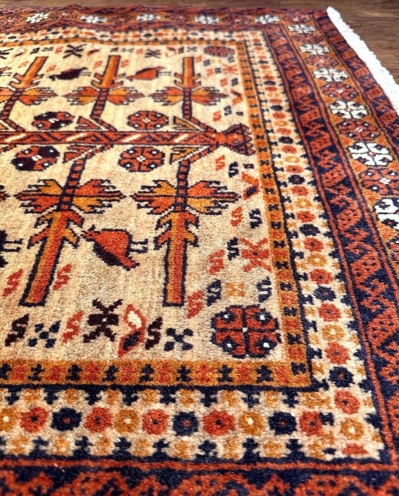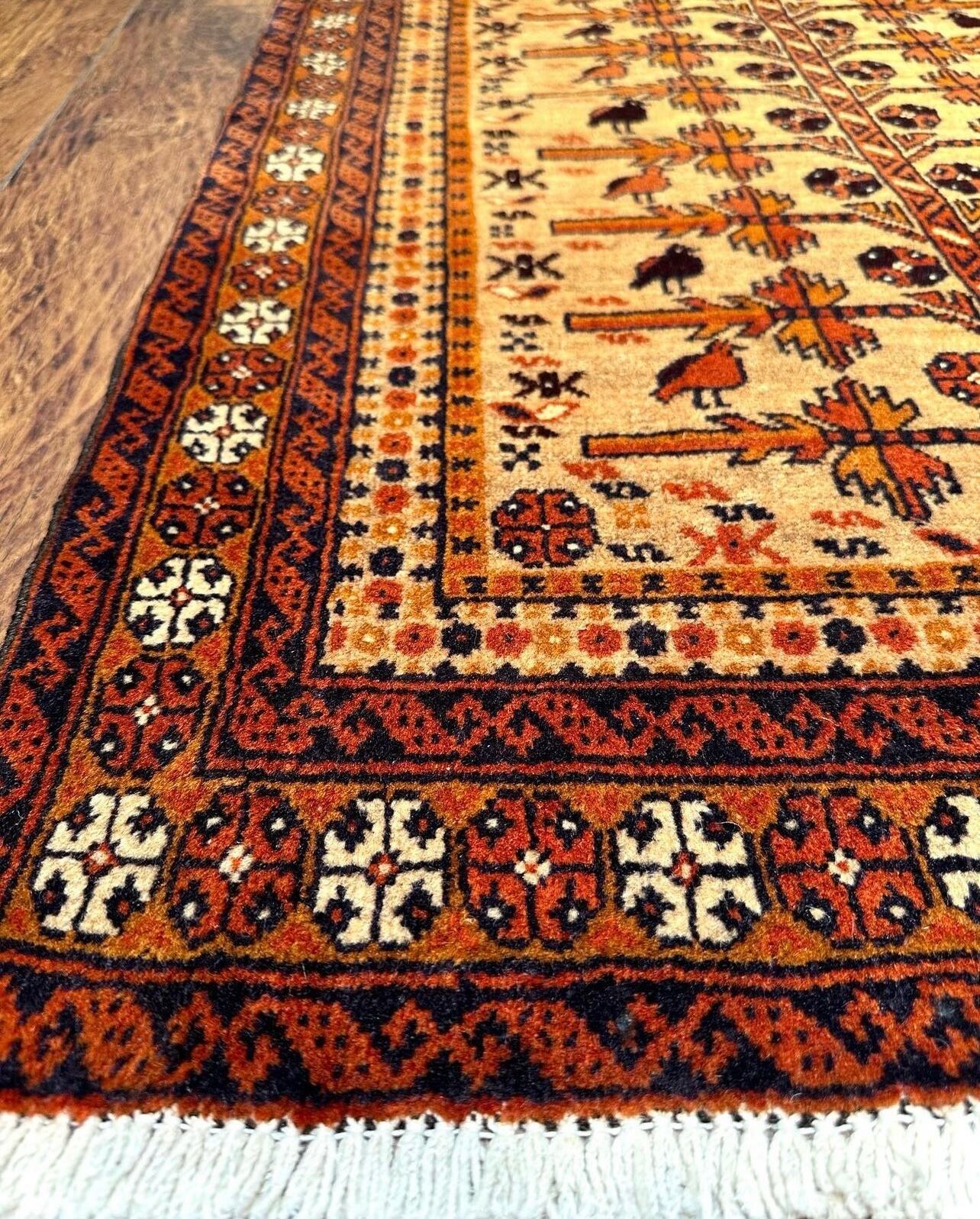 バルーチ族の絨毯は個性的な印象ですが、西イランの部族絨毯やキリムはもちろん、都市で織られた正統派のペルシャ絨毯にも良く合い、インテリアを選ばない不思議な魅力がある絨毯です。織り上がりは1cm程度でそれほど分厚くはありませんが、しっかりとしており織り目が詰まった絨毯です。