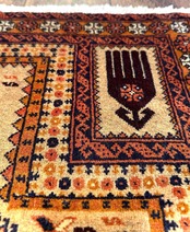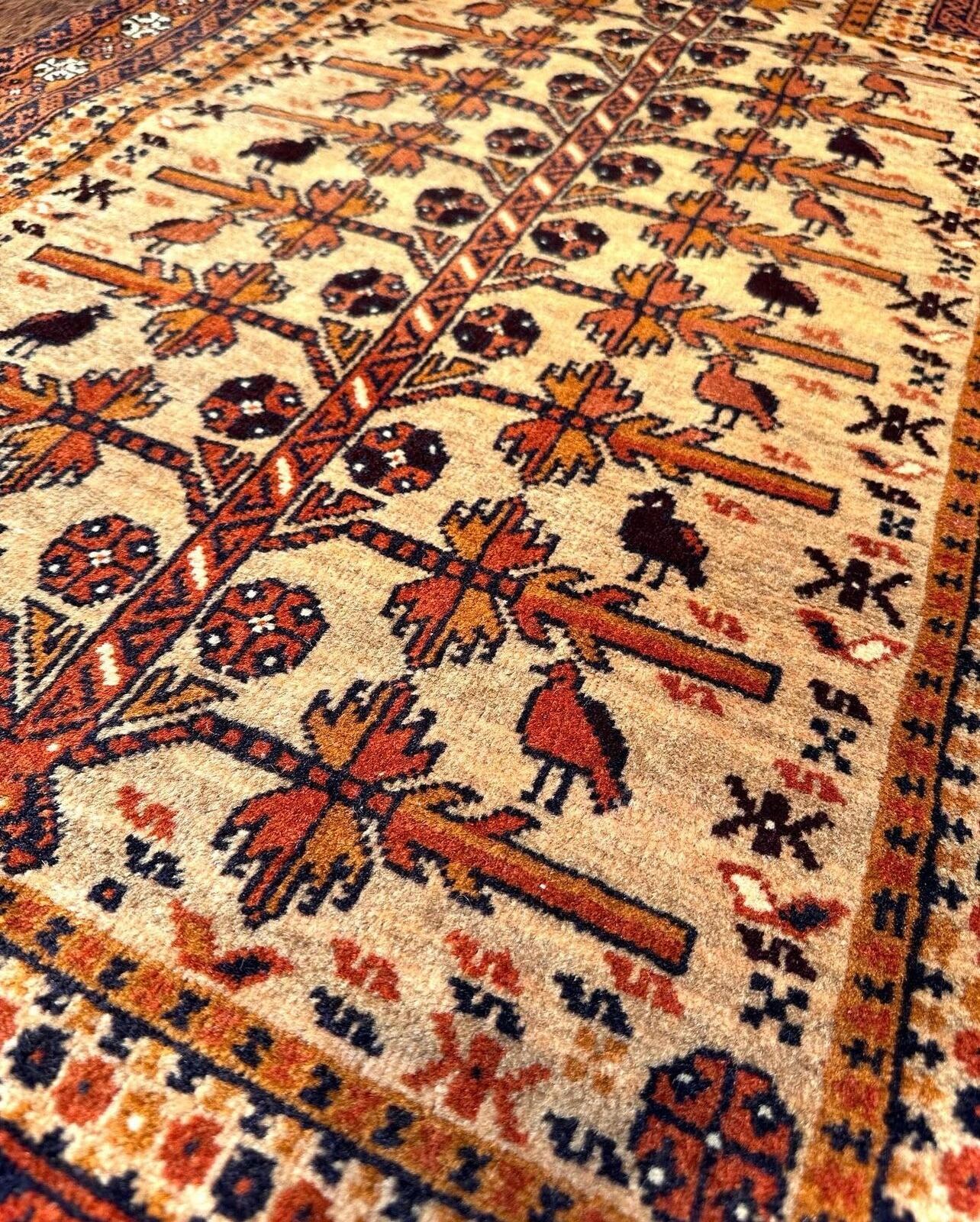 バルーチ族は東イラン、アフガニスタン、パキスタンに渡り住んでいる部族ですが、絨毯を織っているのは東イランと西アフガニスタンにいるバルーチ族だと言われています。バルーチ族の絨毯は重厚な色合いのものが多く、東洋的で渋い印象ですが、実は幾何学紋様へと姿を変えた動物柄が多く含まれています。