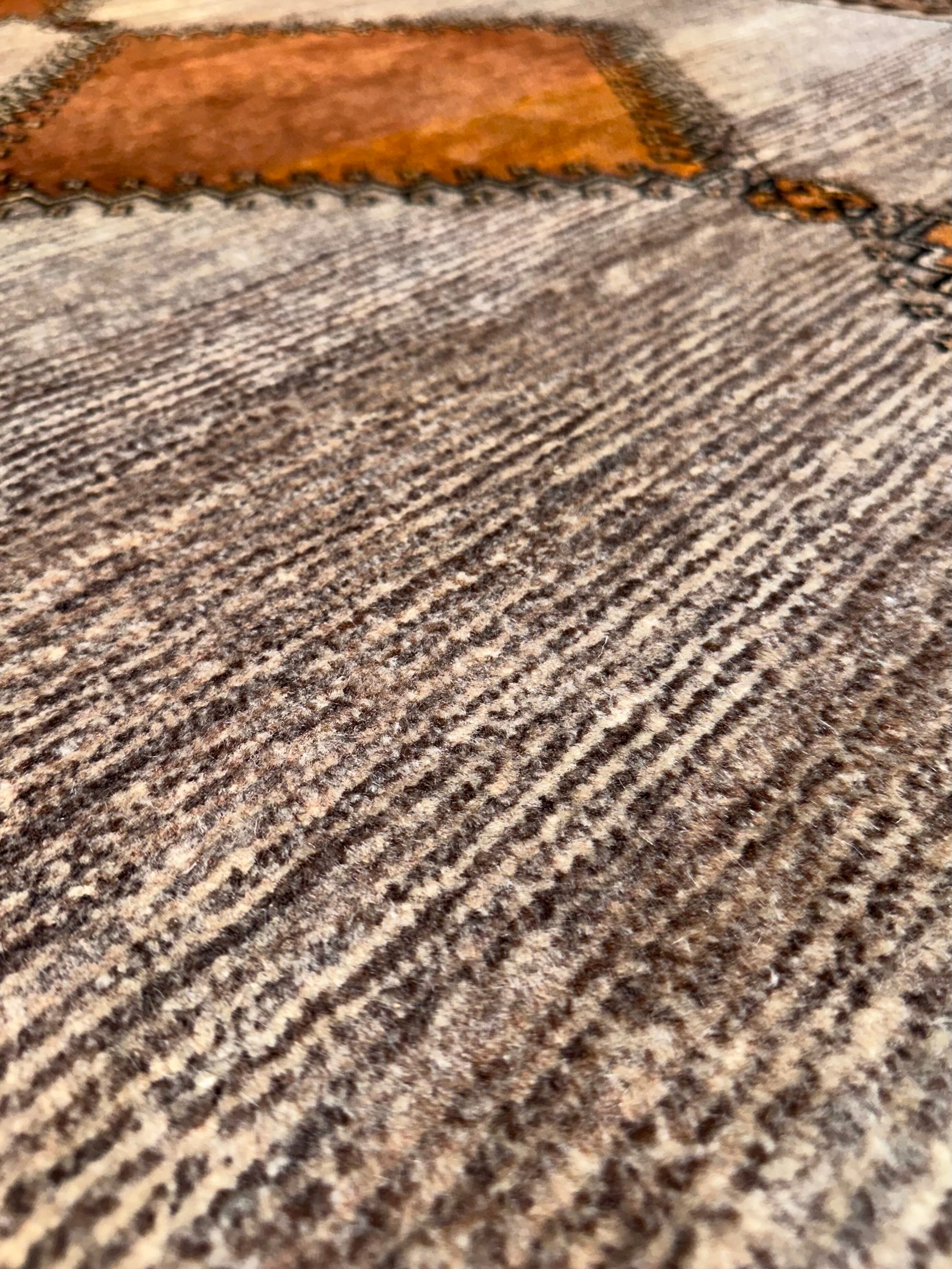 カシュガイ族を象徴する菱形のモチーフ部分は、銅のような光沢感があり美しいです。ナチュラルにトライバルのエッセンスをお部屋に足すことができる一枚です。