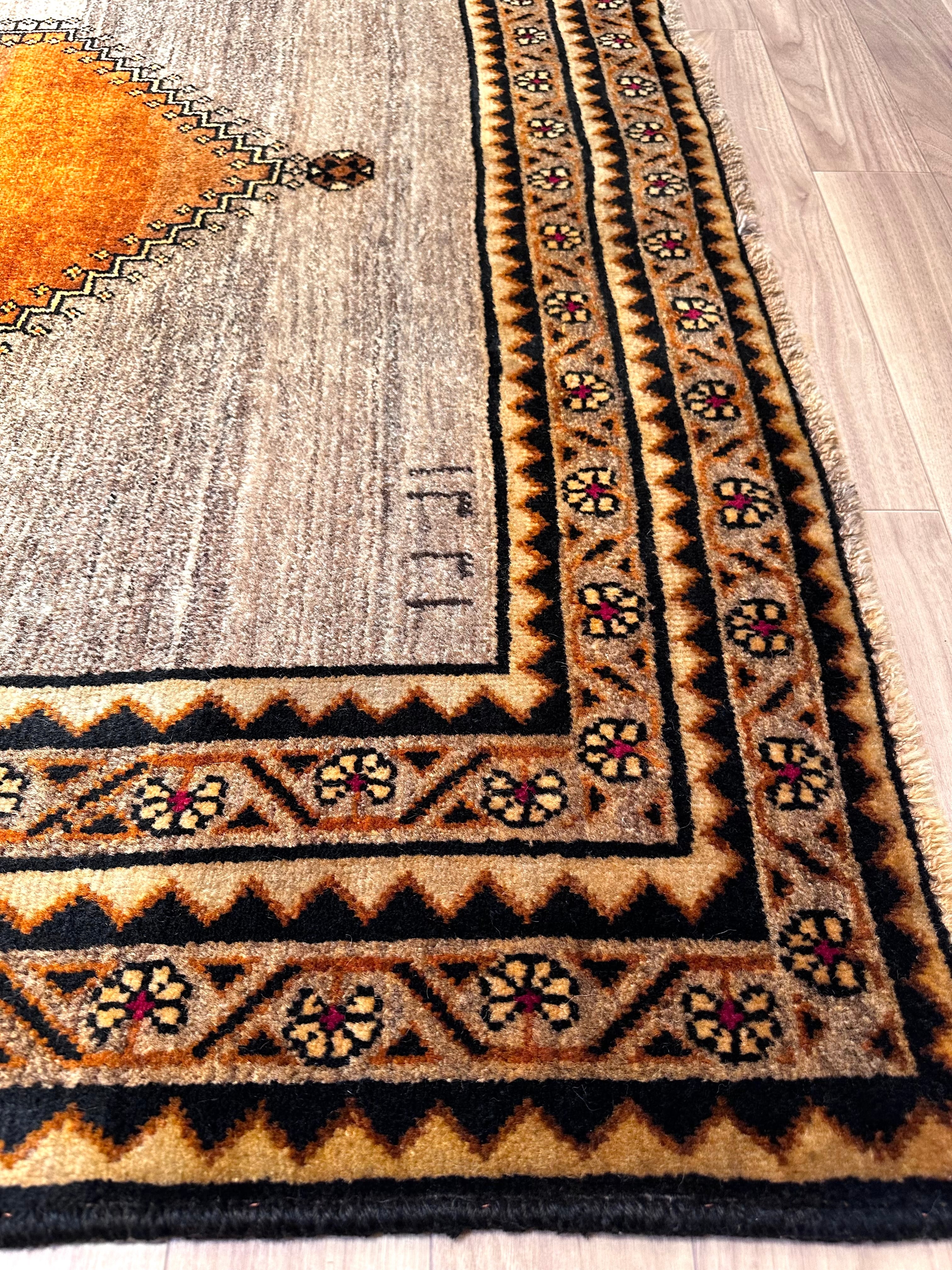 原毛基調のオールドギャッベです。ギャッベの織り終わりの右上にご注目頂くと、イラン暦で1331年…と年号が織り込まれていることから、およそ70年前に織られたものであることが分かります。