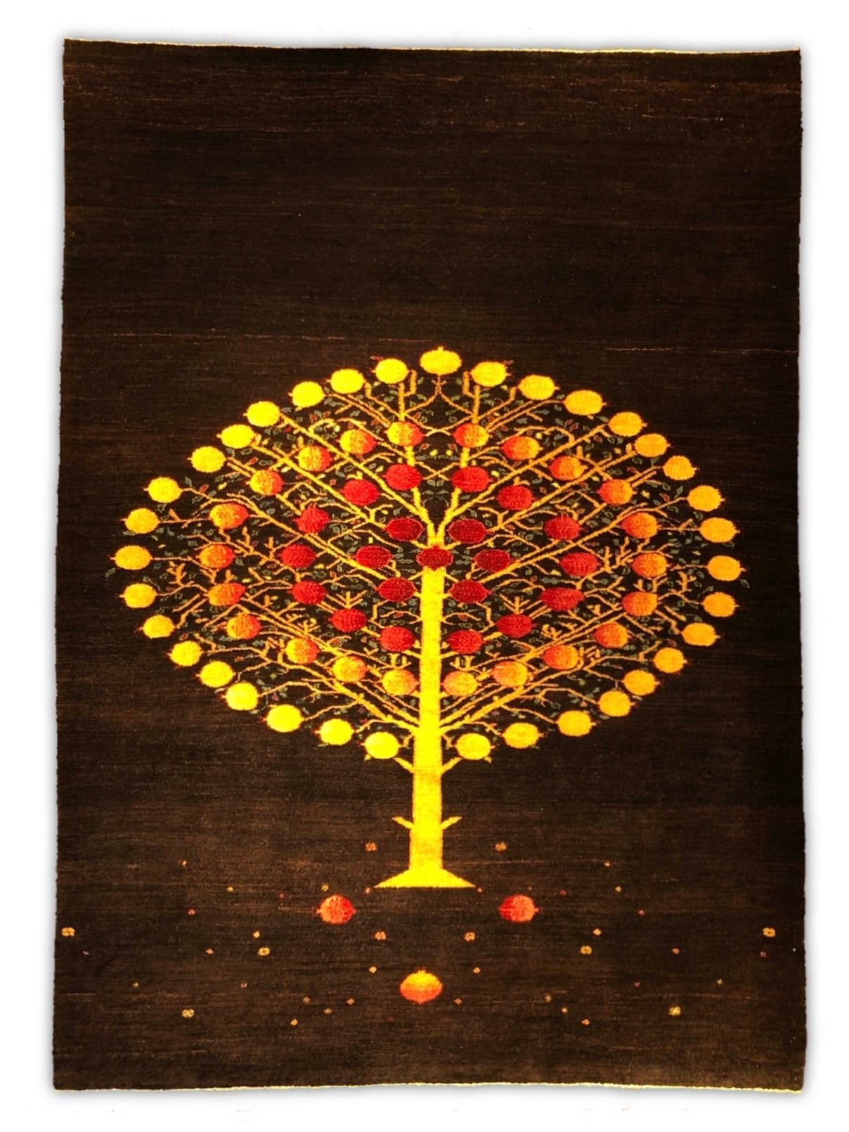 ザクロの木のデザインです。円を描くように実をつけたシルエットは、ザクロを半分に切ってパカっと開けた際の、ギュっと実が詰まった断面そのものも連想させ、ザクロが象徴する「繁栄」のメッセージを、より一層強く引き出しているように感じさせられます。