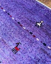 紫のギャッベです。ブルーやピンクが細かく織り交ぜられ、綺麗なグラデーションを成しています。紫は一見するとオシャレ上級者向き?そんなお色に思われがちですが…インテリアのカラーコーディネート的にも、ブルー系の【寒色】とも 、赤・ピンク系の【暖色】とも、どちらとも相性が良い!実は優秀なお色。更に、本店店頭の床のように、濃いブラウン系のフローリングの場合は、しっとり馴染んで、案外使いこなして頂きやすいです。唯一無二のお色で、是非!素敵なコーディネートを。
