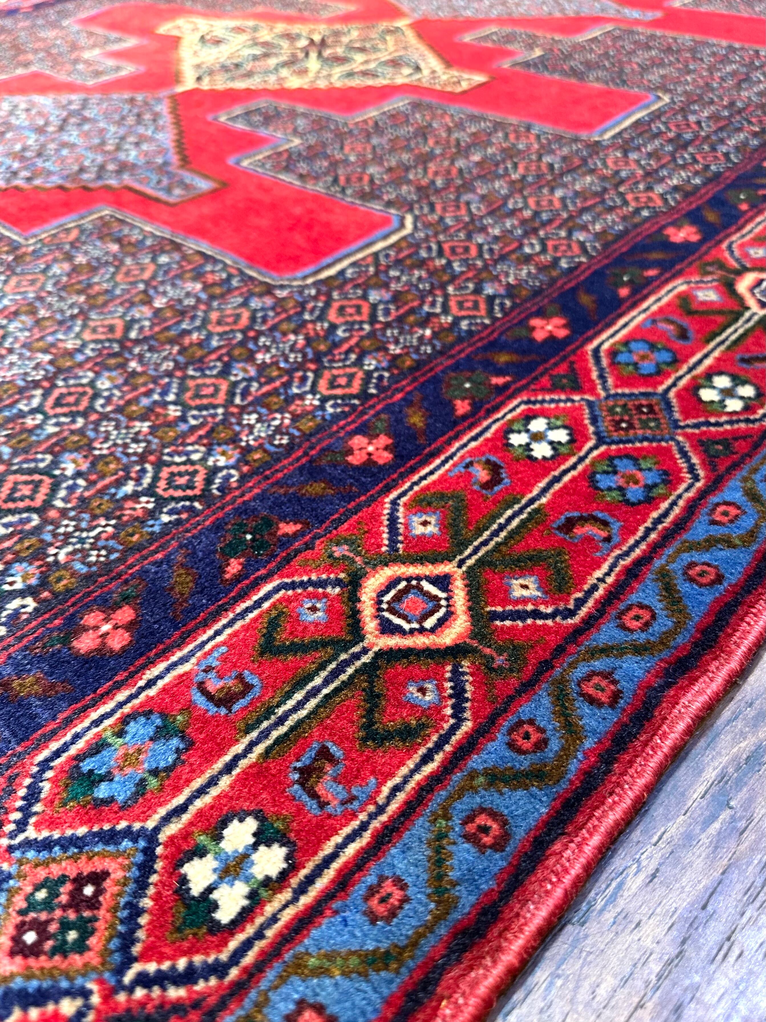 サナンダジとはかつてセネと呼ばれていた地域で、クルド系の人々が多く暮らしています。クルド族は世界最大の「国を持たない民族」で、その人口が集中するクルデイスターン地方の総領域はフランスの国土面積と同一な程巨大です。イランに暮らすクルド族の絨毯は、絨毯全体に何層にも跨る大きな菱形と、基調を埋めつくように織り込まれる細やかな「マヒ」と呼ばれる連続紋様が特徴的です。