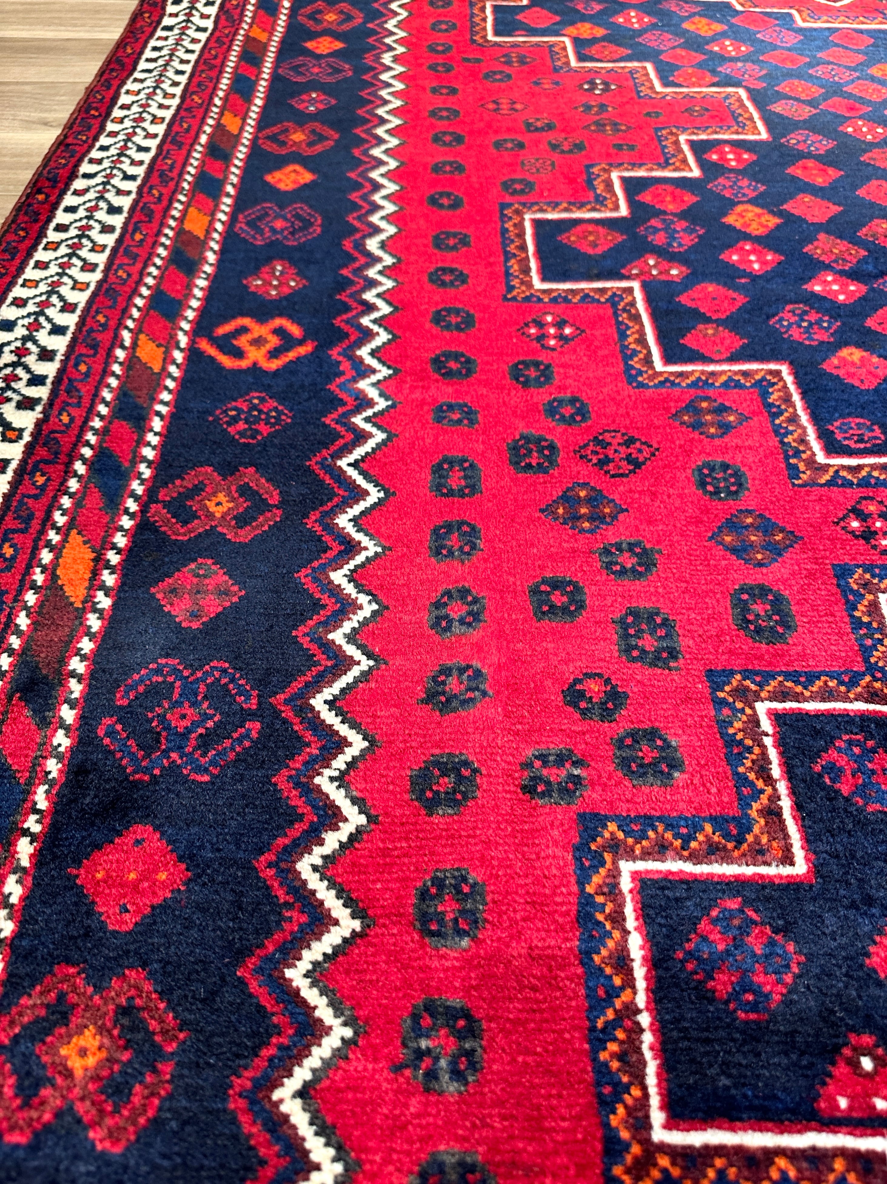 三つのメダリオンが囲まれているようなデザインパターンは、アフシャール族が織る絨毯の代表的なスタイルです。