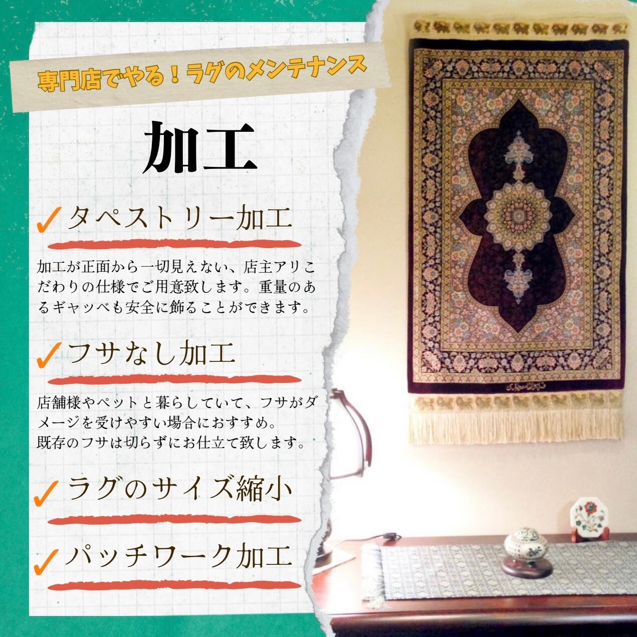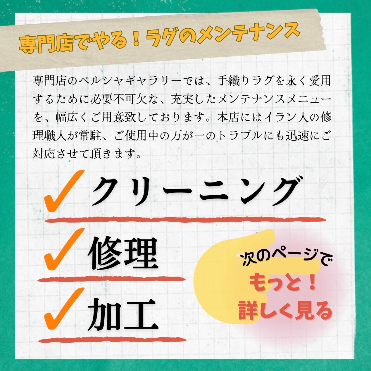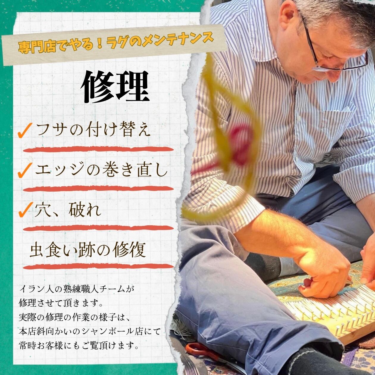 又、本店にイラン人の熟練修理職人も常駐しているため、ご使用中の万が一のトラブルにも迅速にご対応させて頂きます。