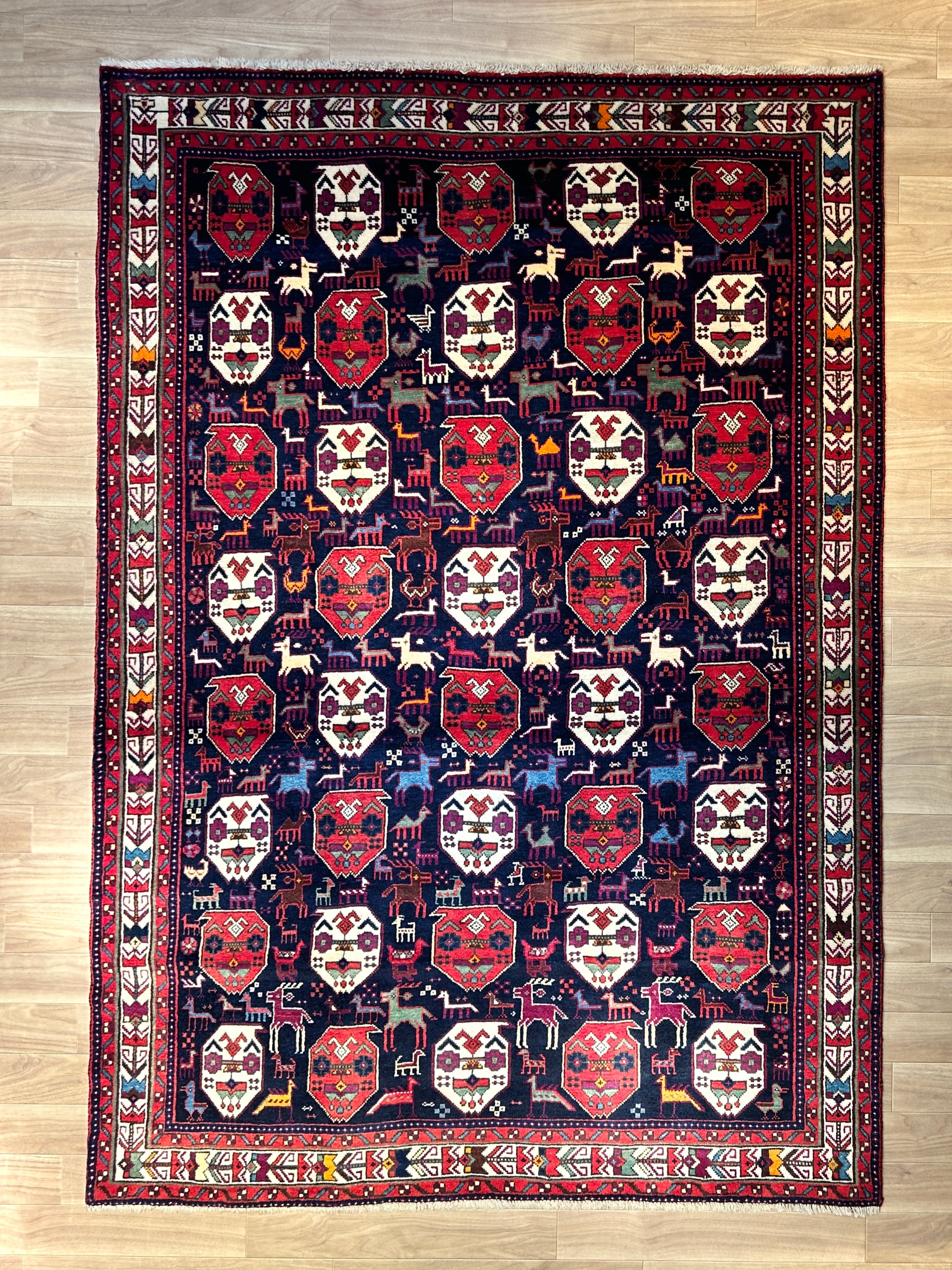 三つのメダリオンが囲まれているようなデザインパターンは、アフシャール族が織る絨毯の代表的なスタイルです。