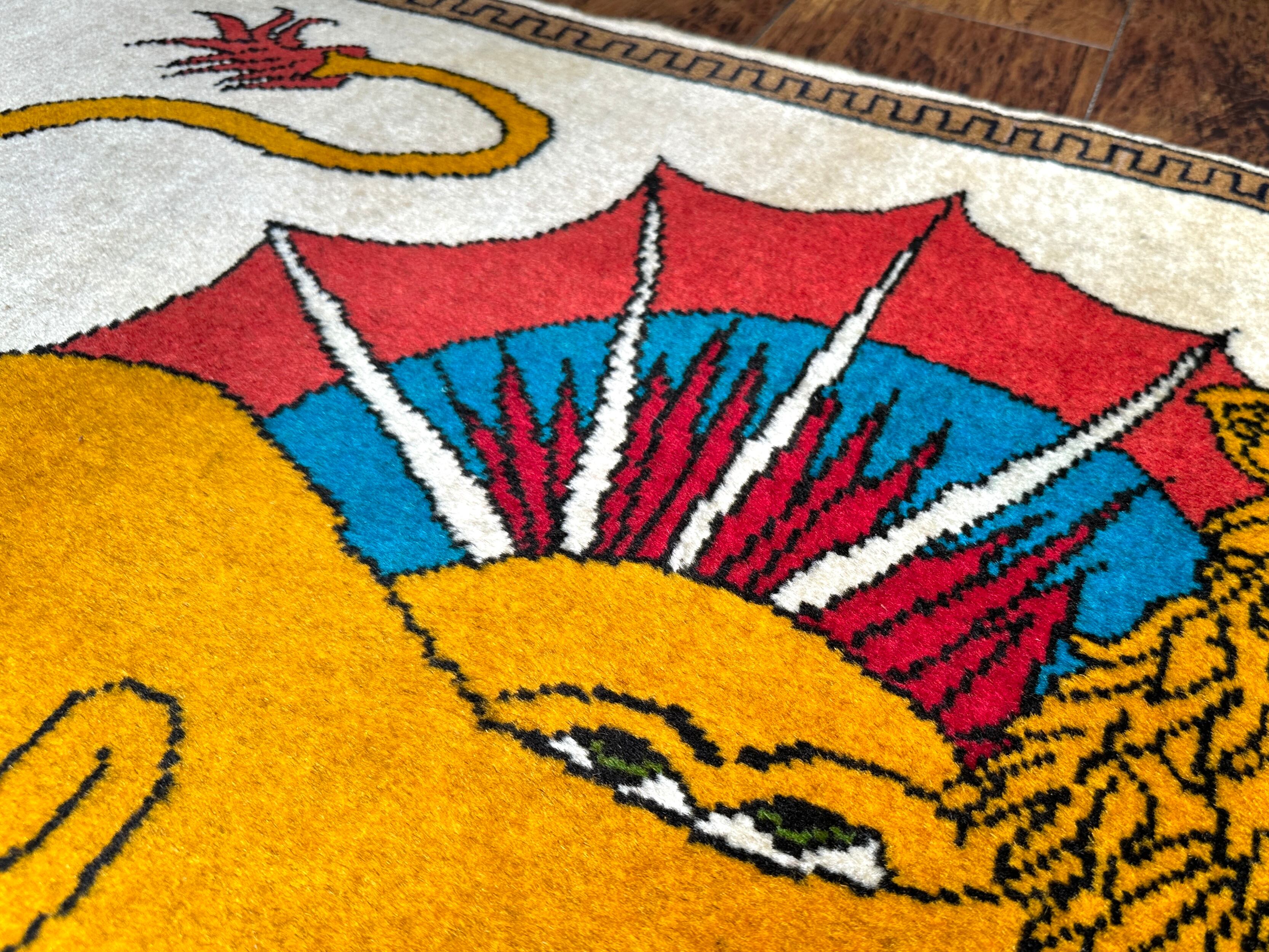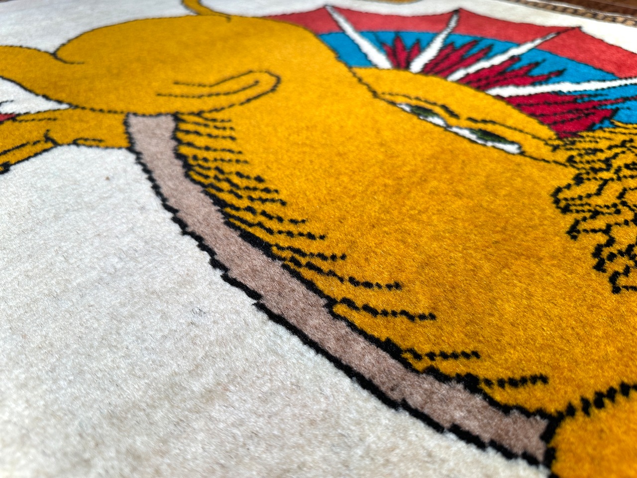 伝統的には赤基調で織られることが多く、このように真っ白な原毛基調は珍しいので、明るいトーンでライオン柄を取り入れたい方は必見です。