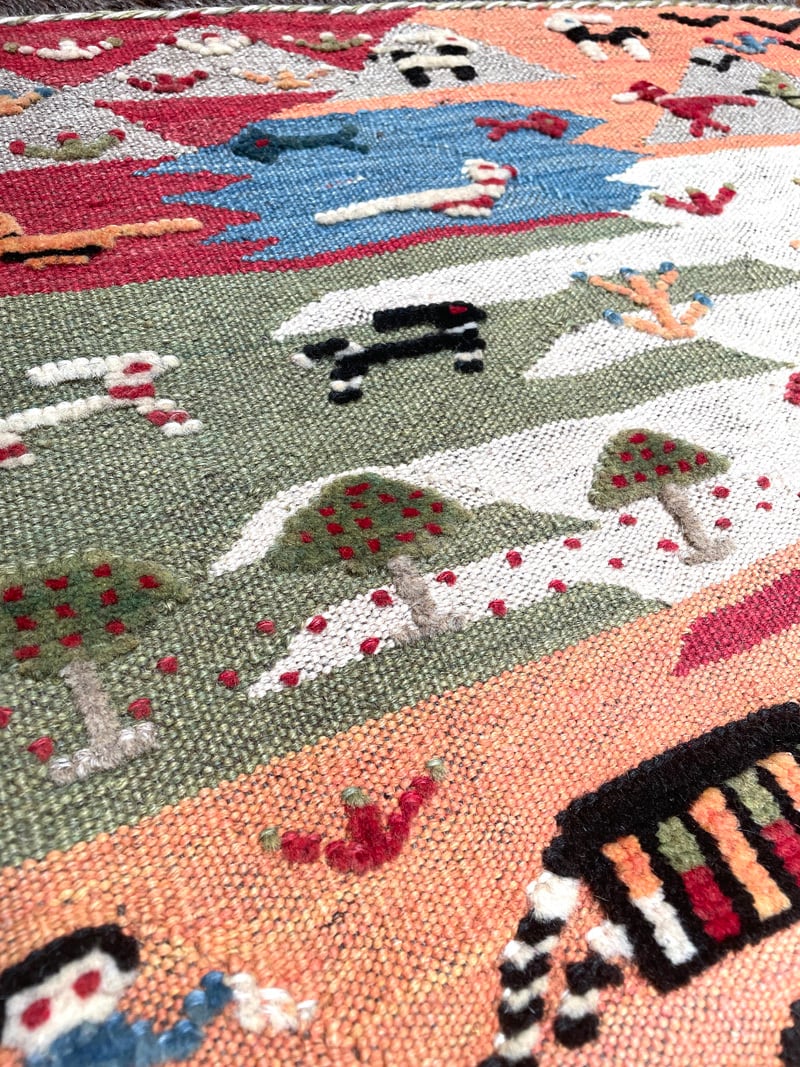 南西イランらしい明るい色合いで、ギャッベで良く知られるヤギや樹木等のモチーフがギャッベのような毛足のある織りになっていて、立体感があり楽しさにあふれています。