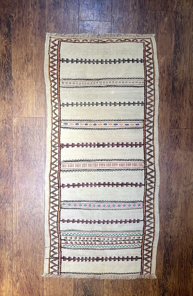 平織りに刺繍を施したオールドキリム。元々はもっと長く織られたものをカットしたピースです。
