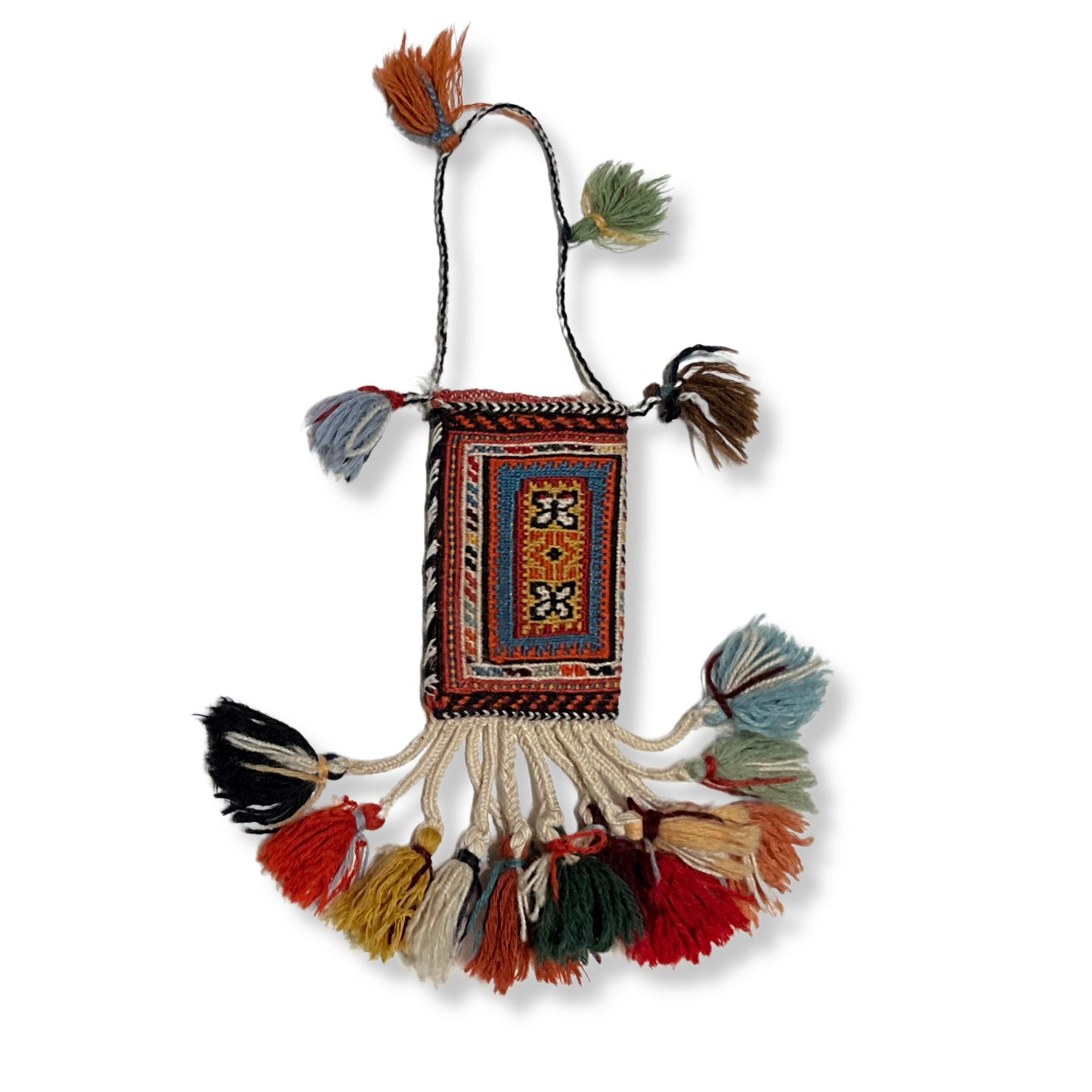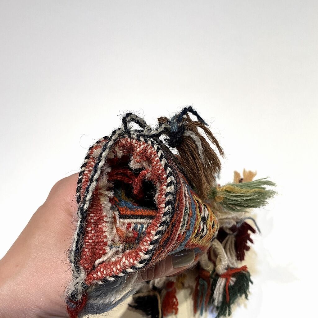 南イラン、シールジャン産のソマック織りキリムで作られた小さな袋物です。古くはイラン各地の遊牧民族は身近な素材であるウールを敷物や掛物だけではなく、袋物も作り生活用品としていました。小さな袋は古くから作られており、こまごまとした生活の品々を収納していました。