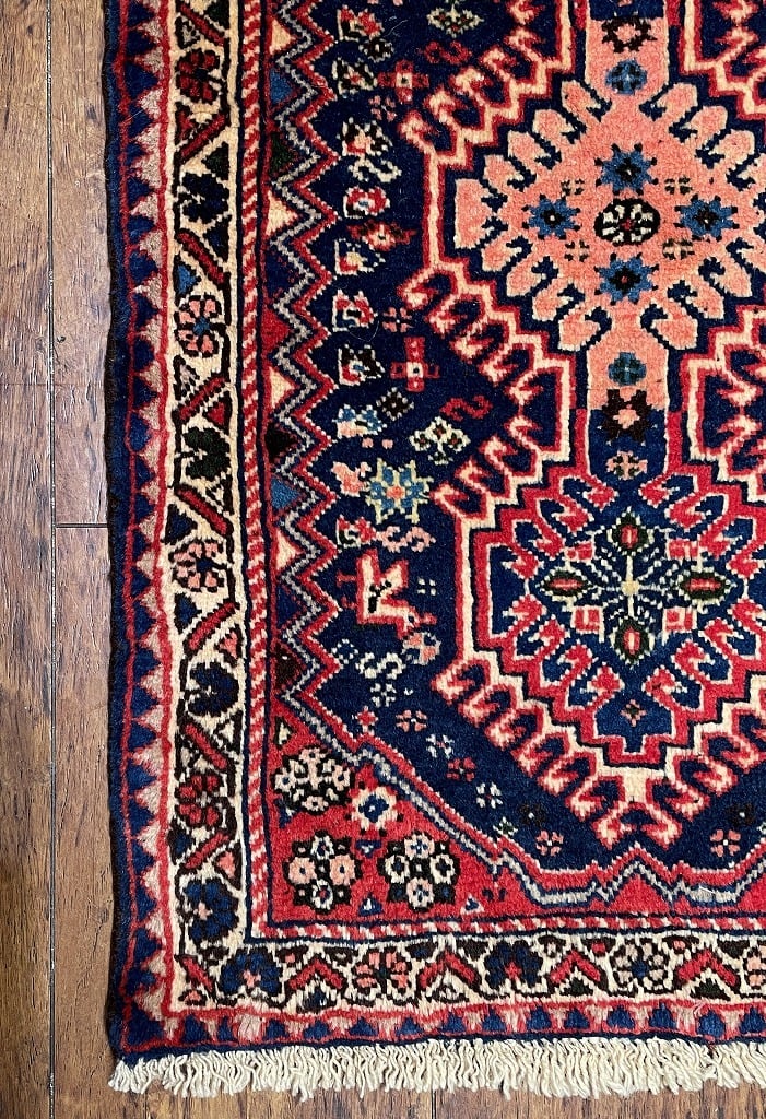 『赤』ではなく、少しピンクがかったローズレッドと、『紺』ではない深い青が部族絨毯としては重すぎず、周りのインテリアと馴染みが良いのも魅力です。