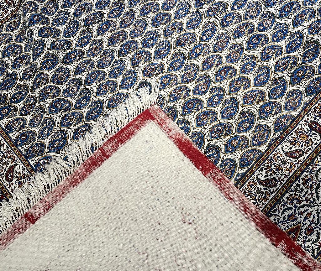 ペルシャ更紗は、イランの古都イスファハンで、伝統的な手法で作られているハンドプリントの手工芸品です。ペルシャ語では「ガラムカーリ」と呼ばれます。更紗職人により、梨の木を繰り抜いて作られた木判で、押し染めを繰り返してデザインを作っていきます。紋様を一つ完成させるのにも、異なる型判や色を塗り替えて押すので、紋様が出来上がるまでには4〜5回もの作業を必要とします。