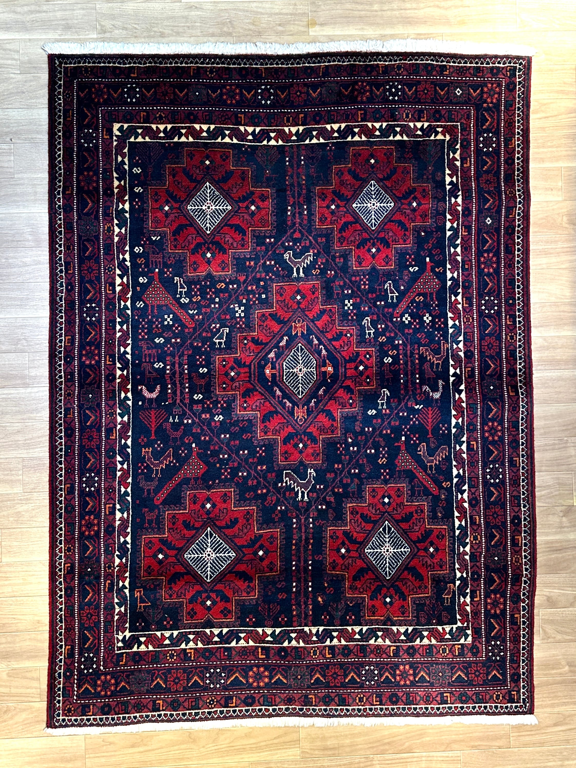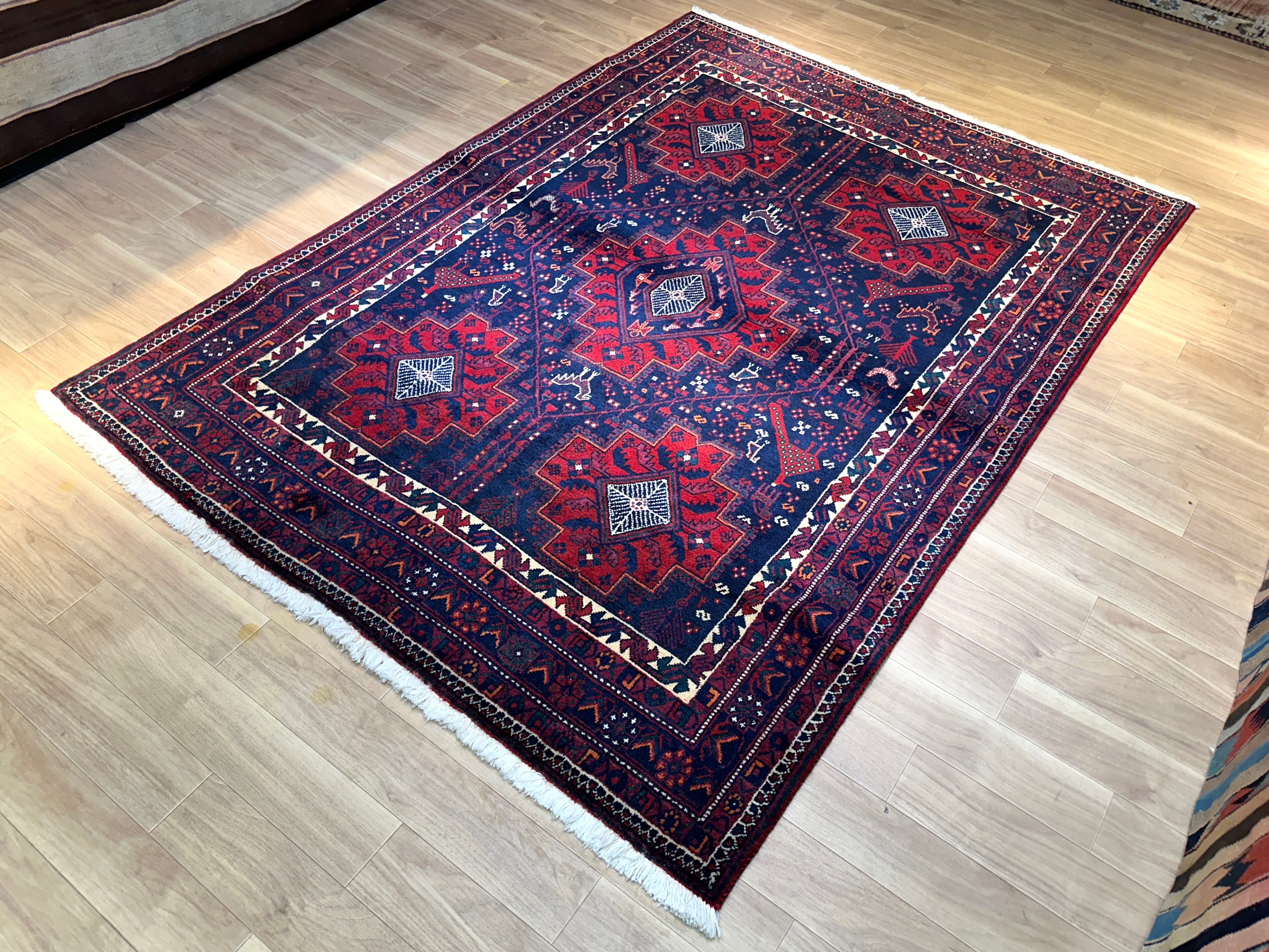 赤×紺の渋カッコいい配色をベースに、ボルドーの差し色が効いた一枚。ズームインして見ると、孔雀やヤギ、厄除けのケルマック紋様etc…愛嬌いっぱいのモチーフで隙間なく埋め尽くされ、「引きはクールに、ディテールは可愛らしく」遊び心を忘れたくない粋な大人のお部屋に、ぴったりのオールド絨毯となっております。YouTube Ep152でもご紹介中です⬇︎