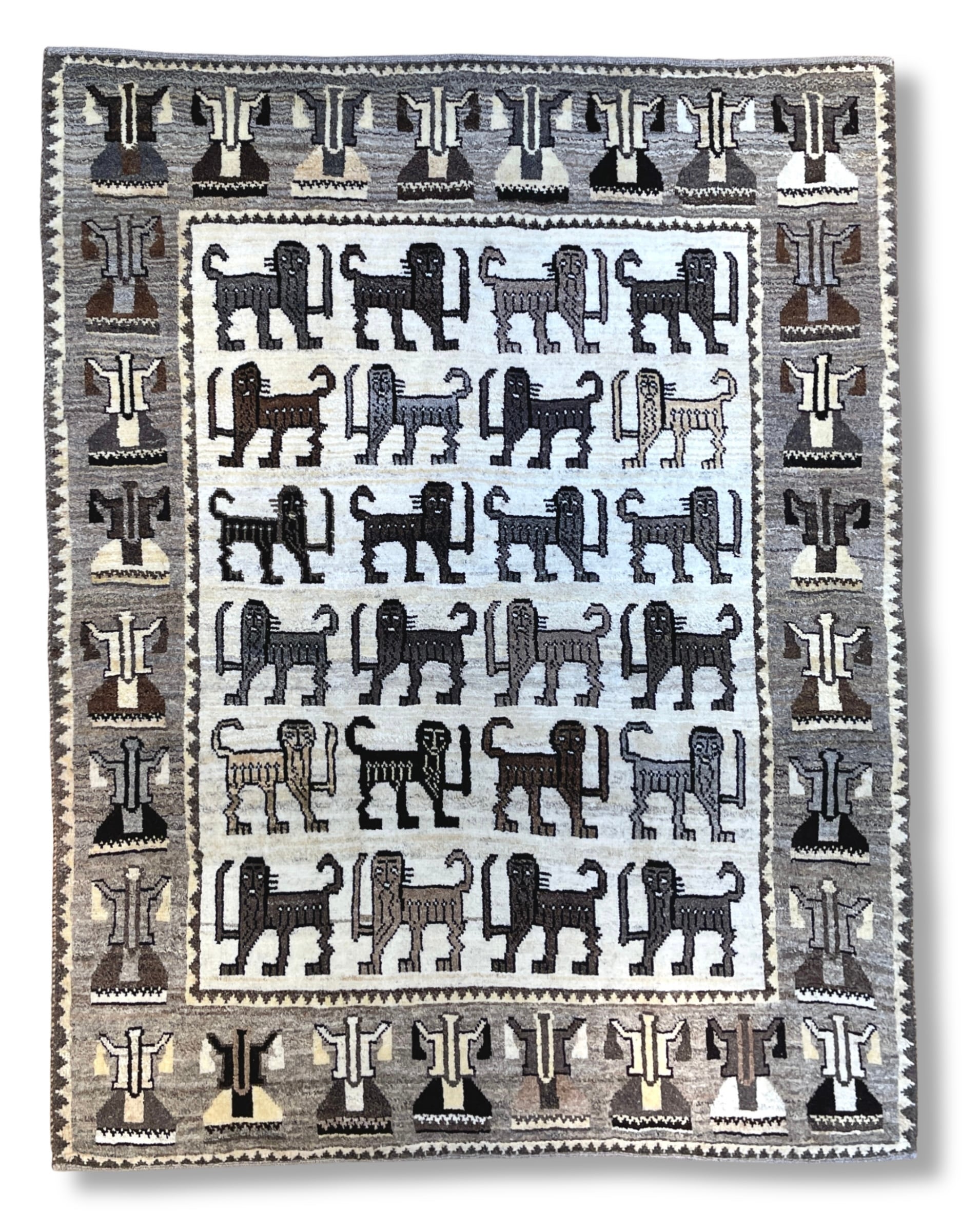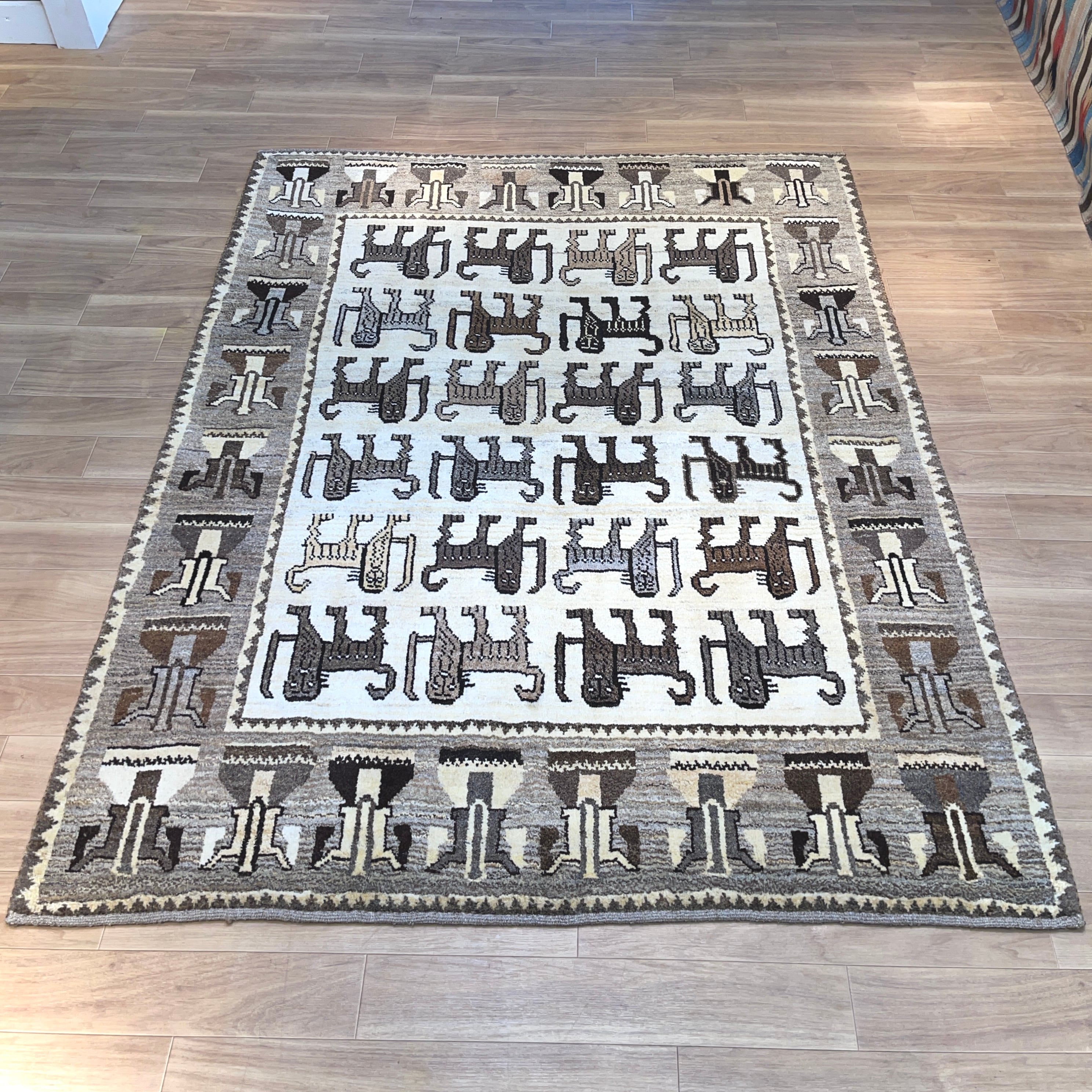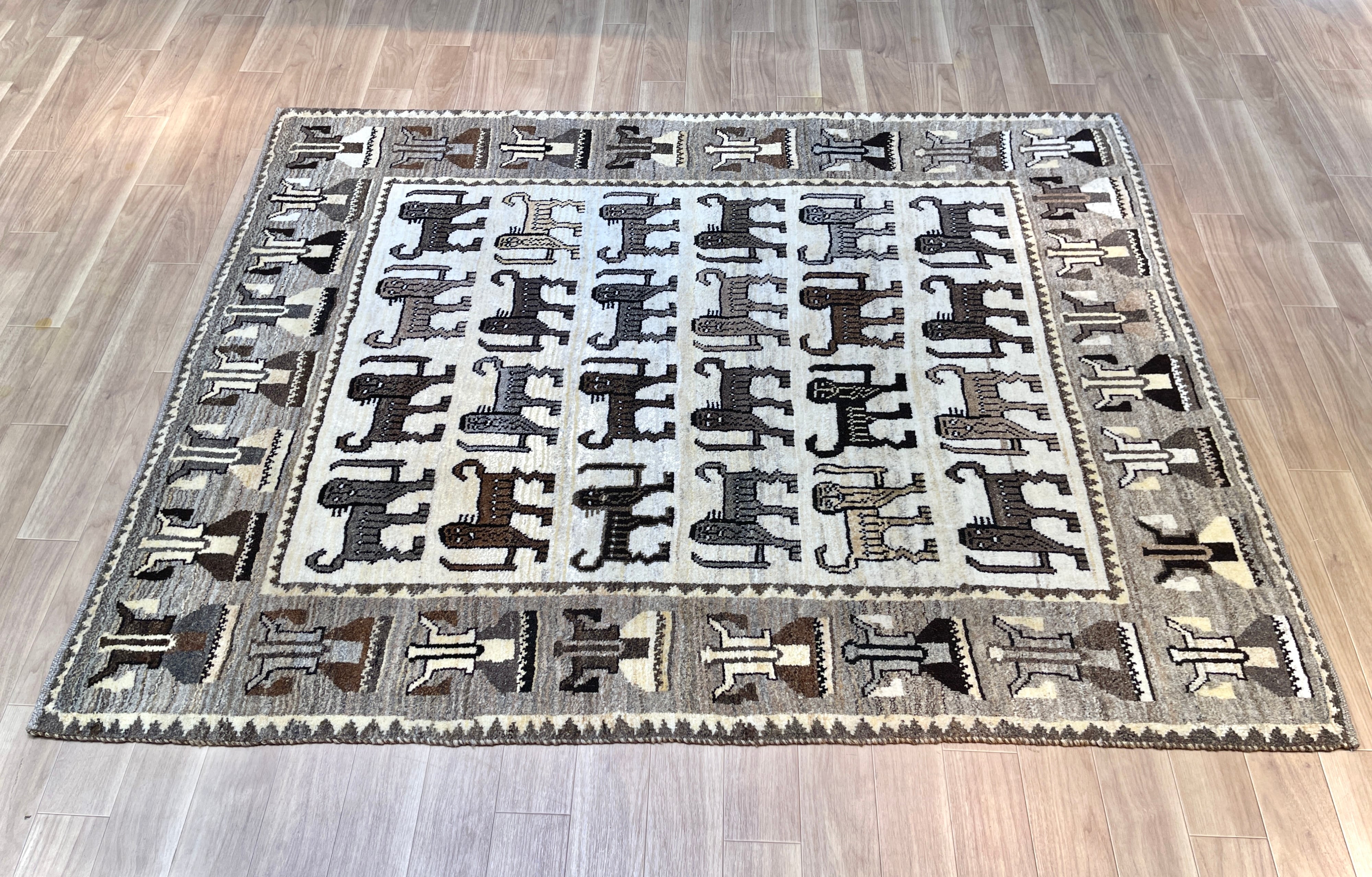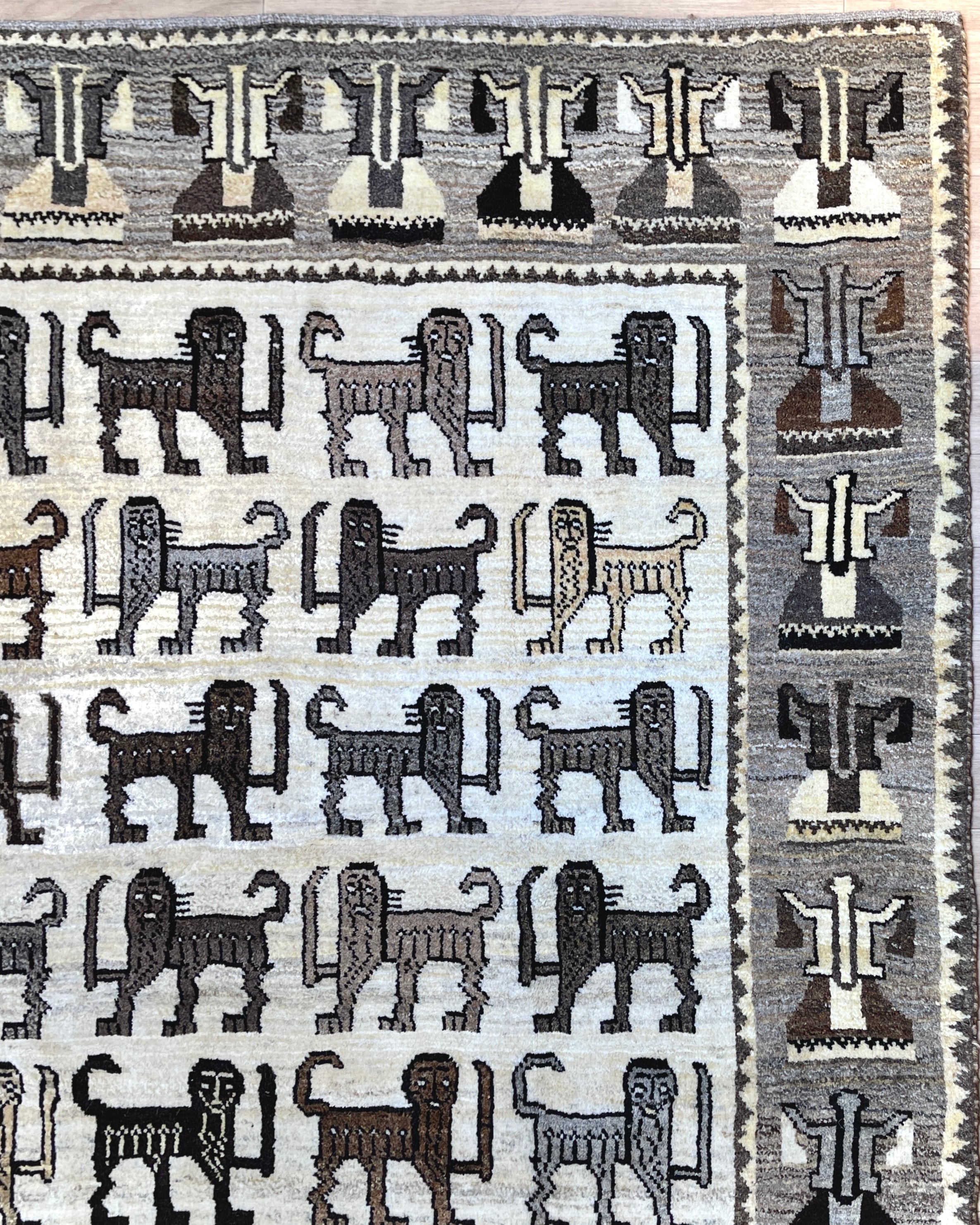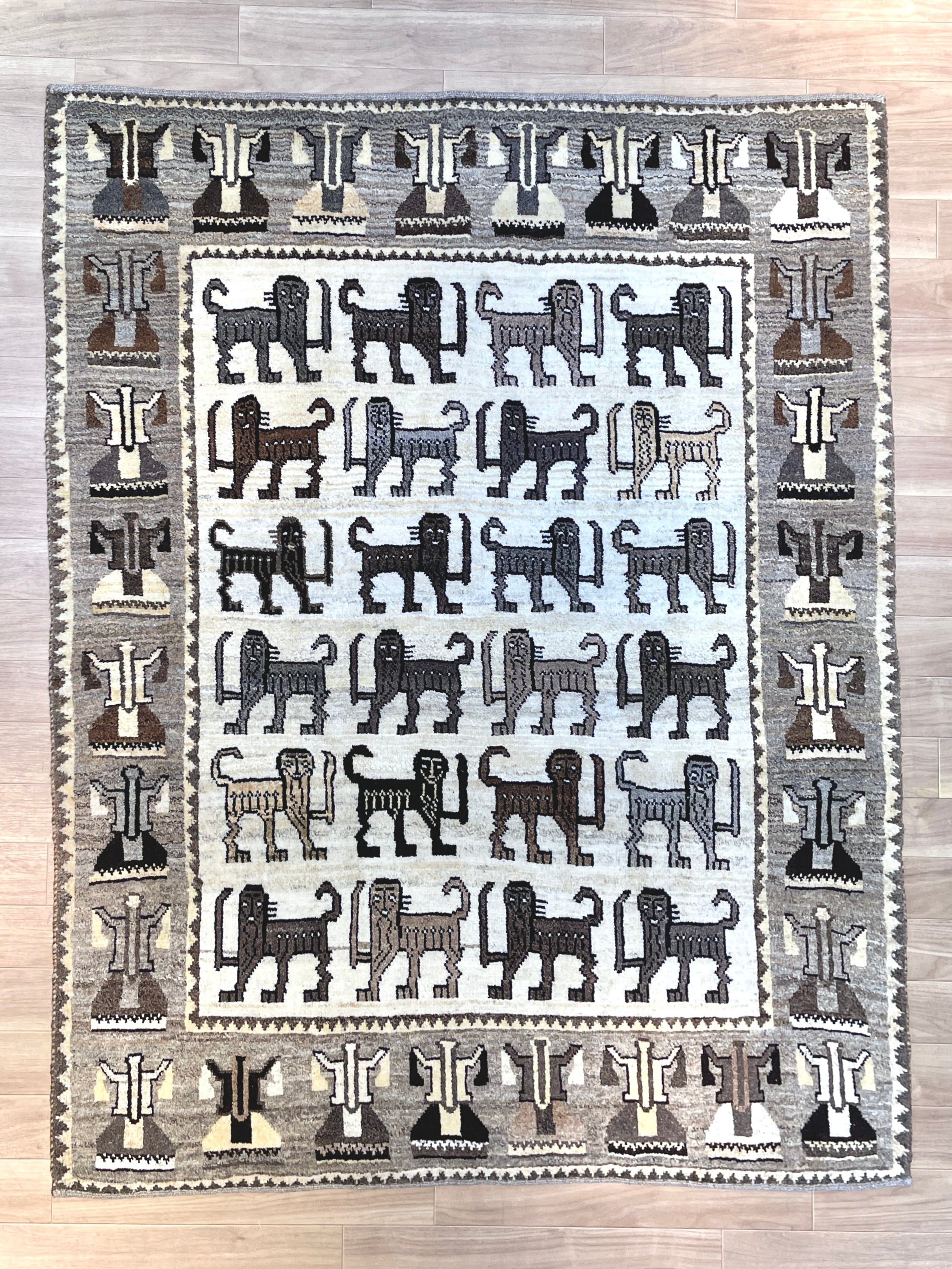 ペルシャにまつわる剣を持ったライオンと、カシュガイ族の「ハンカチの踊り」が、フレーム一周にぐるりと描かれています。同モチーフの配列デザインですが、ライオンのお顔付きが一匹ずつ違うのがご愛嬌〜♪ 手織りならではの楽しさがあります。