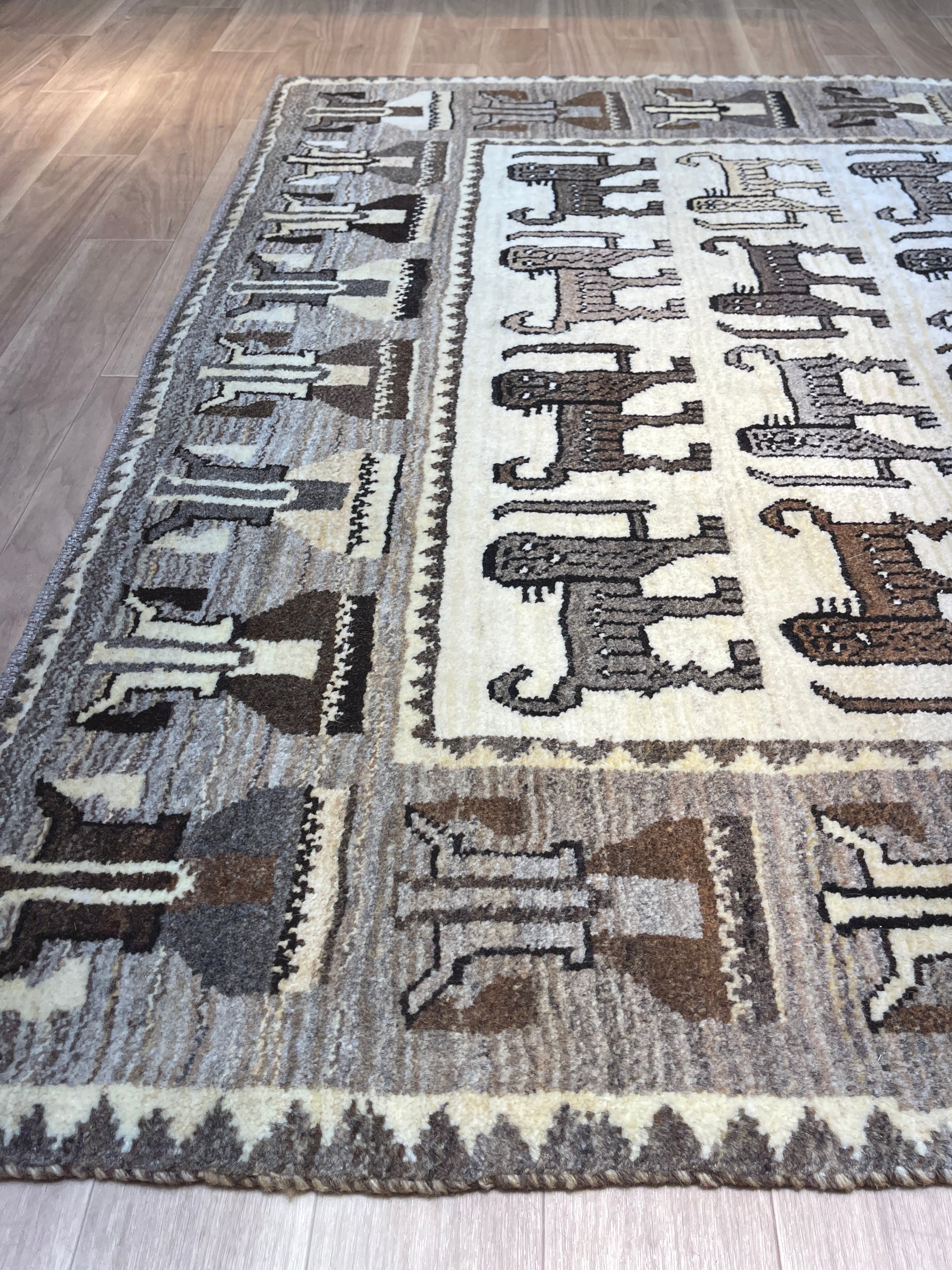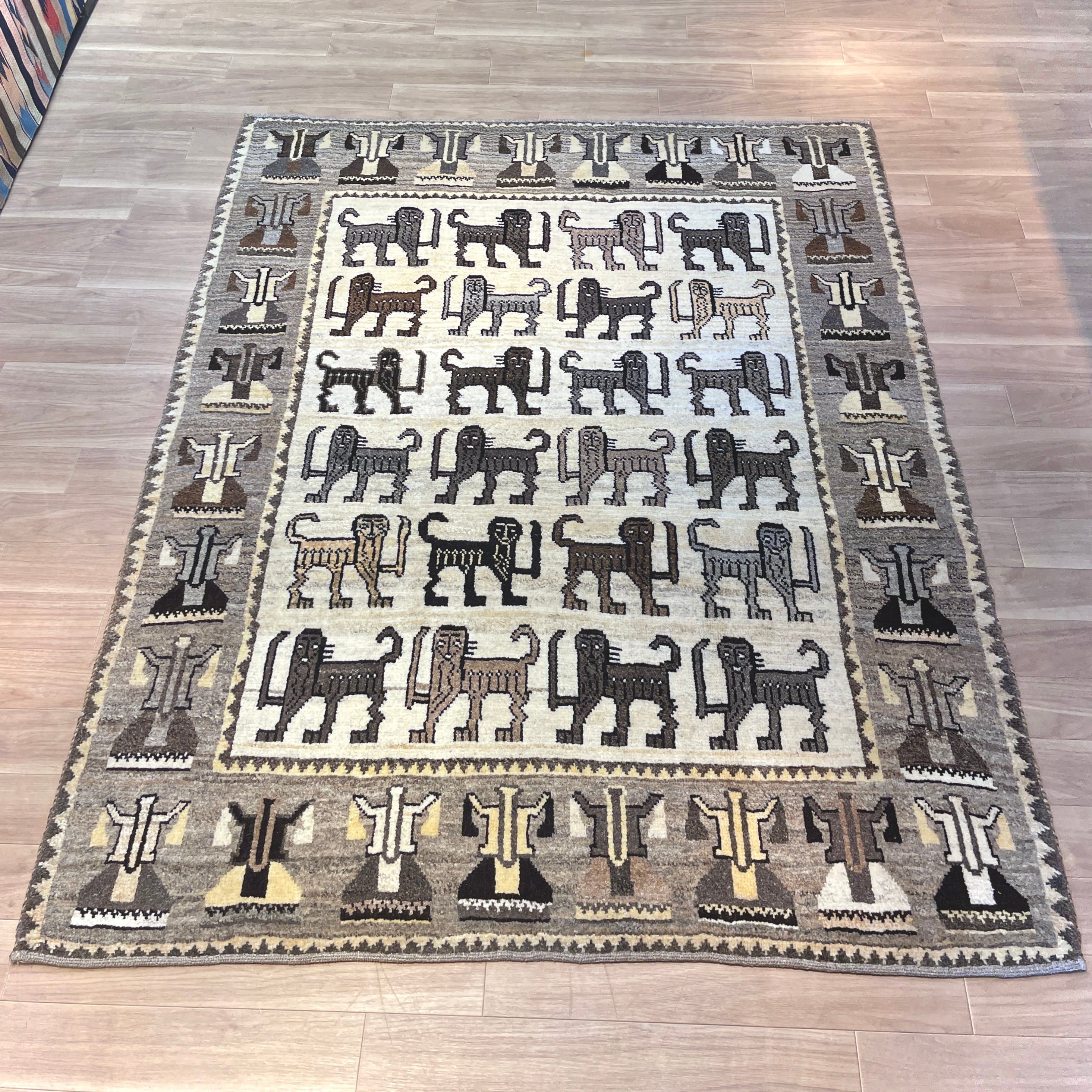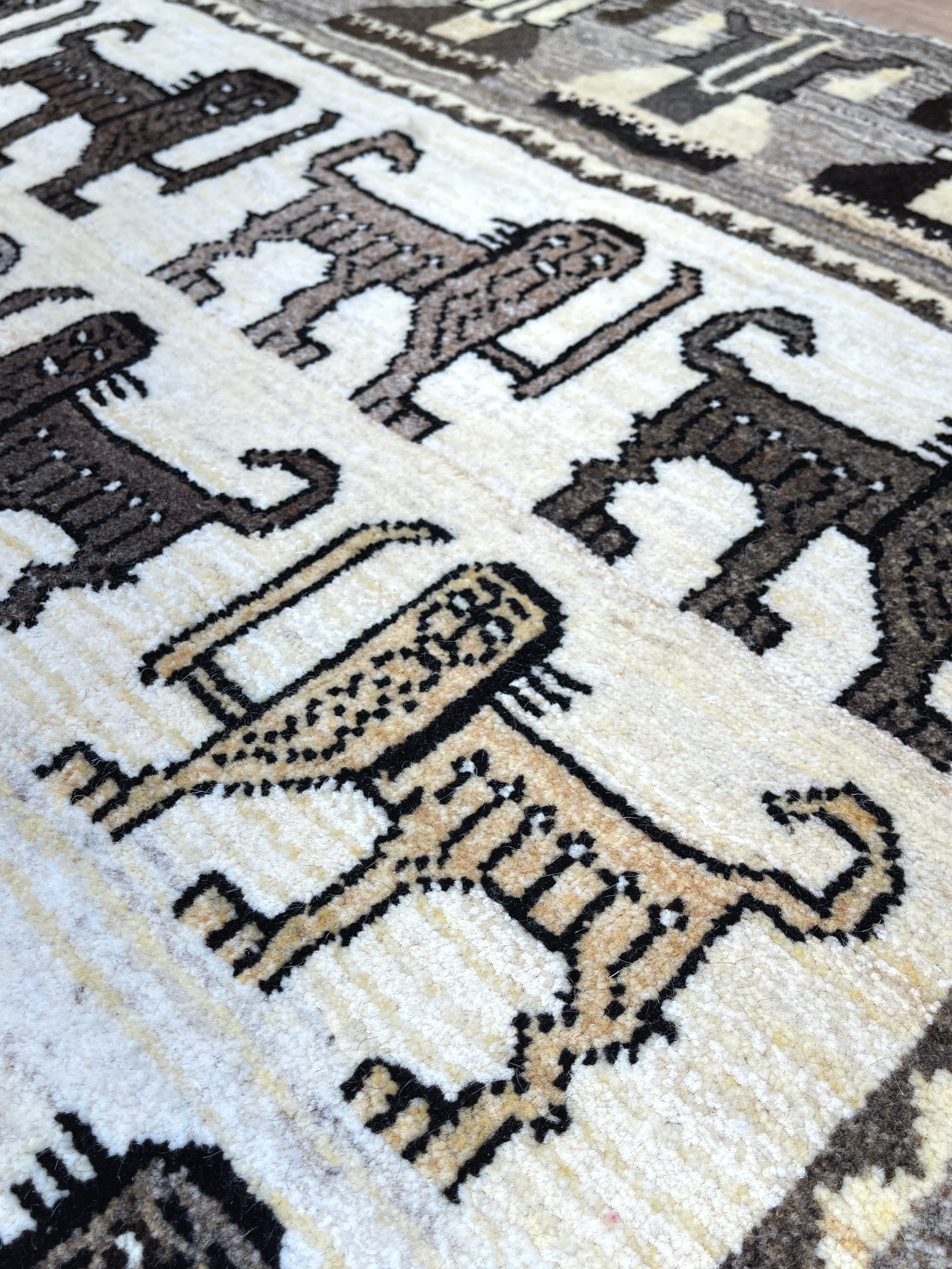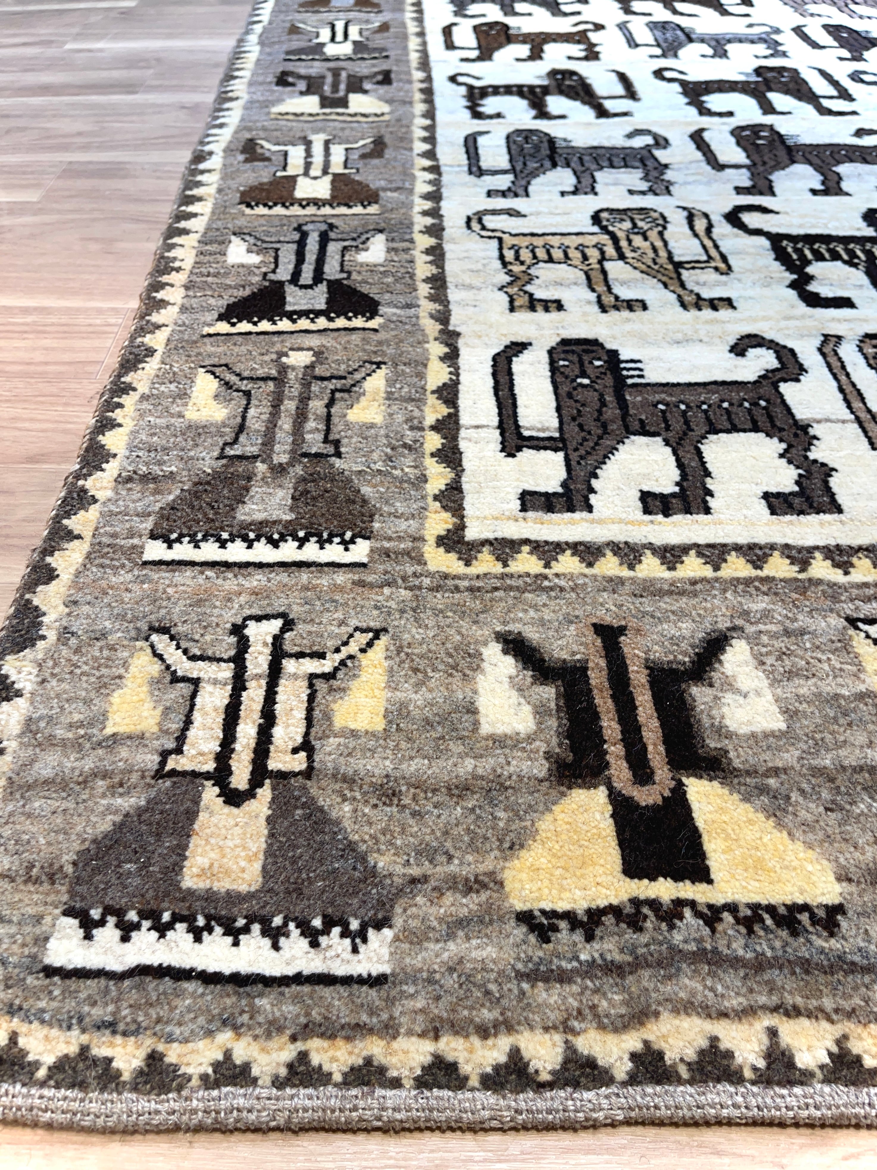 ペルシャにまつわる剣を持ったライオンと、カシュガイ族の「ハンカチの踊り」が、フレーム一周にぐるりと描かれています。同モチーフの配列デザインですが、ライオンのお顔付きが一匹ずつ違うのがご愛嬌〜♪ 手織りならではの楽しさがあります。