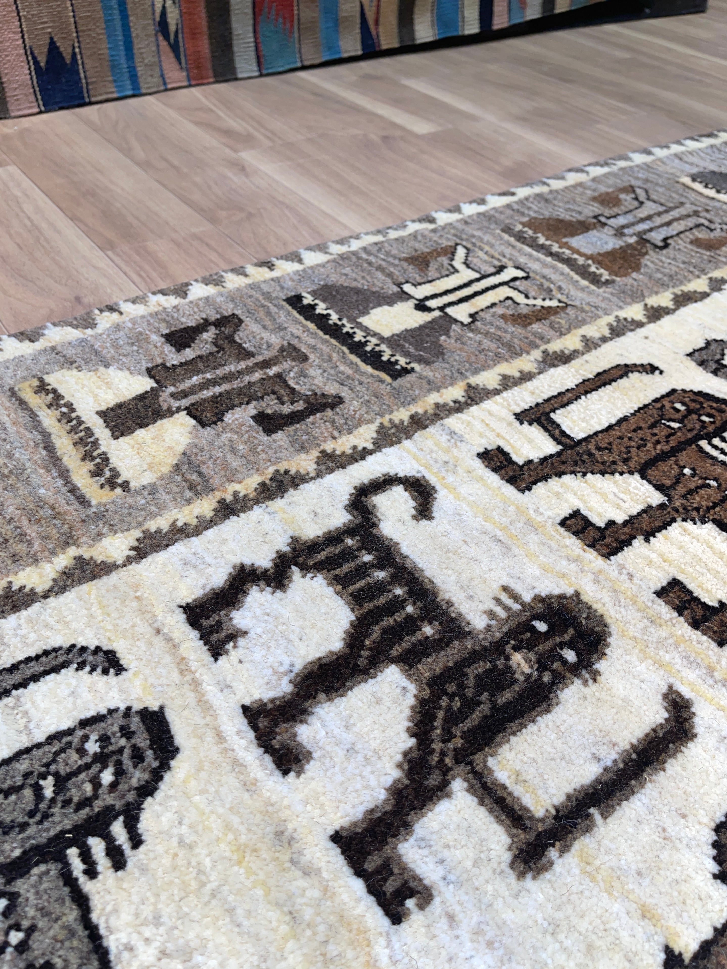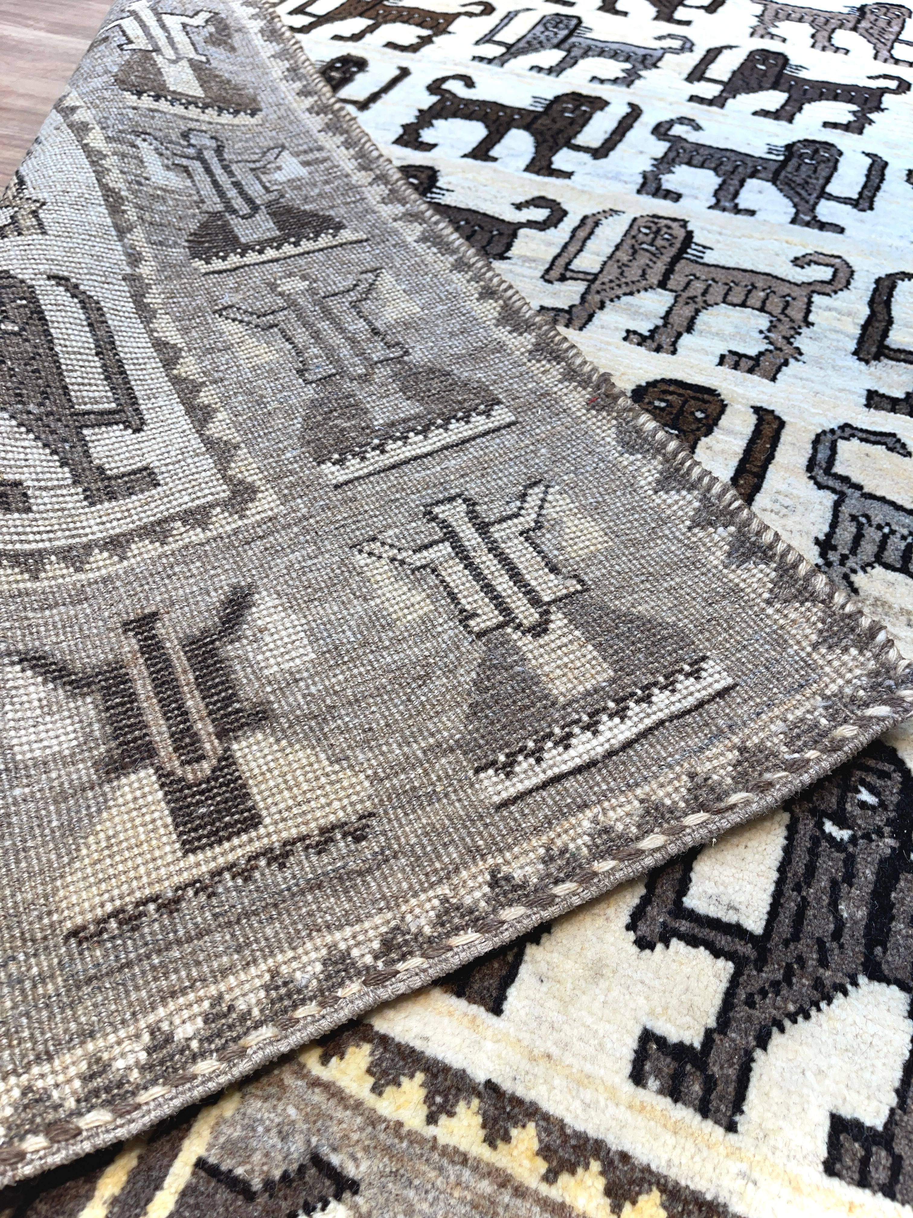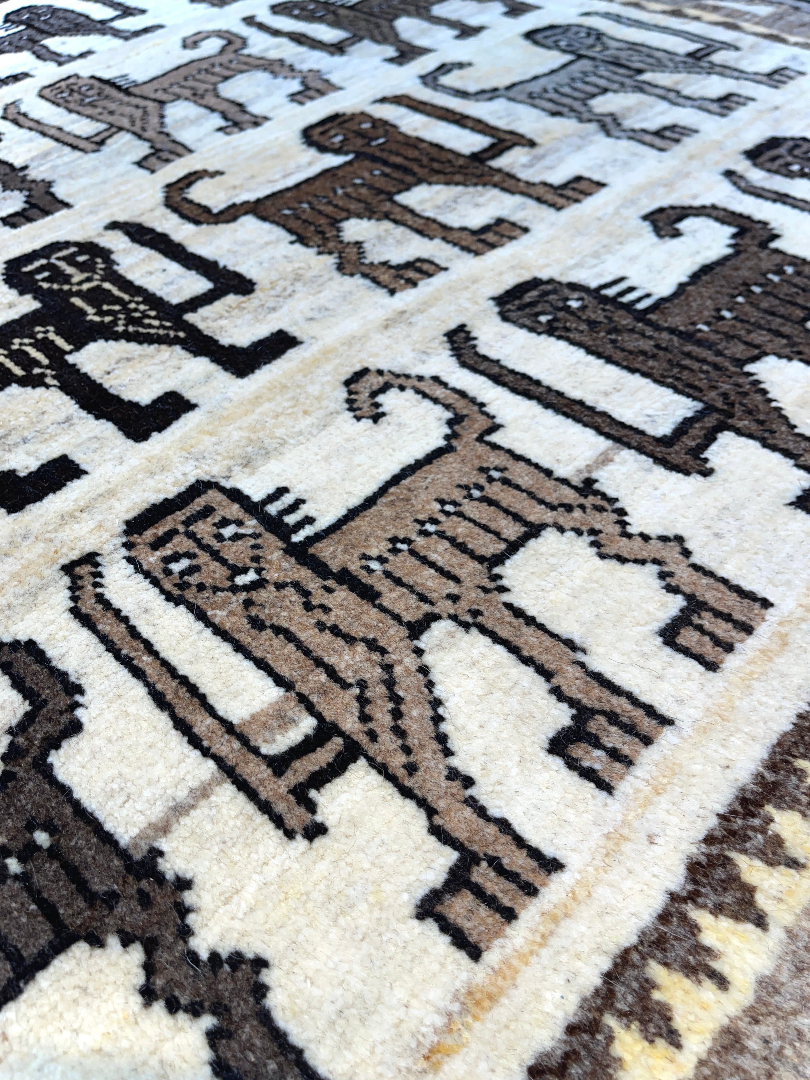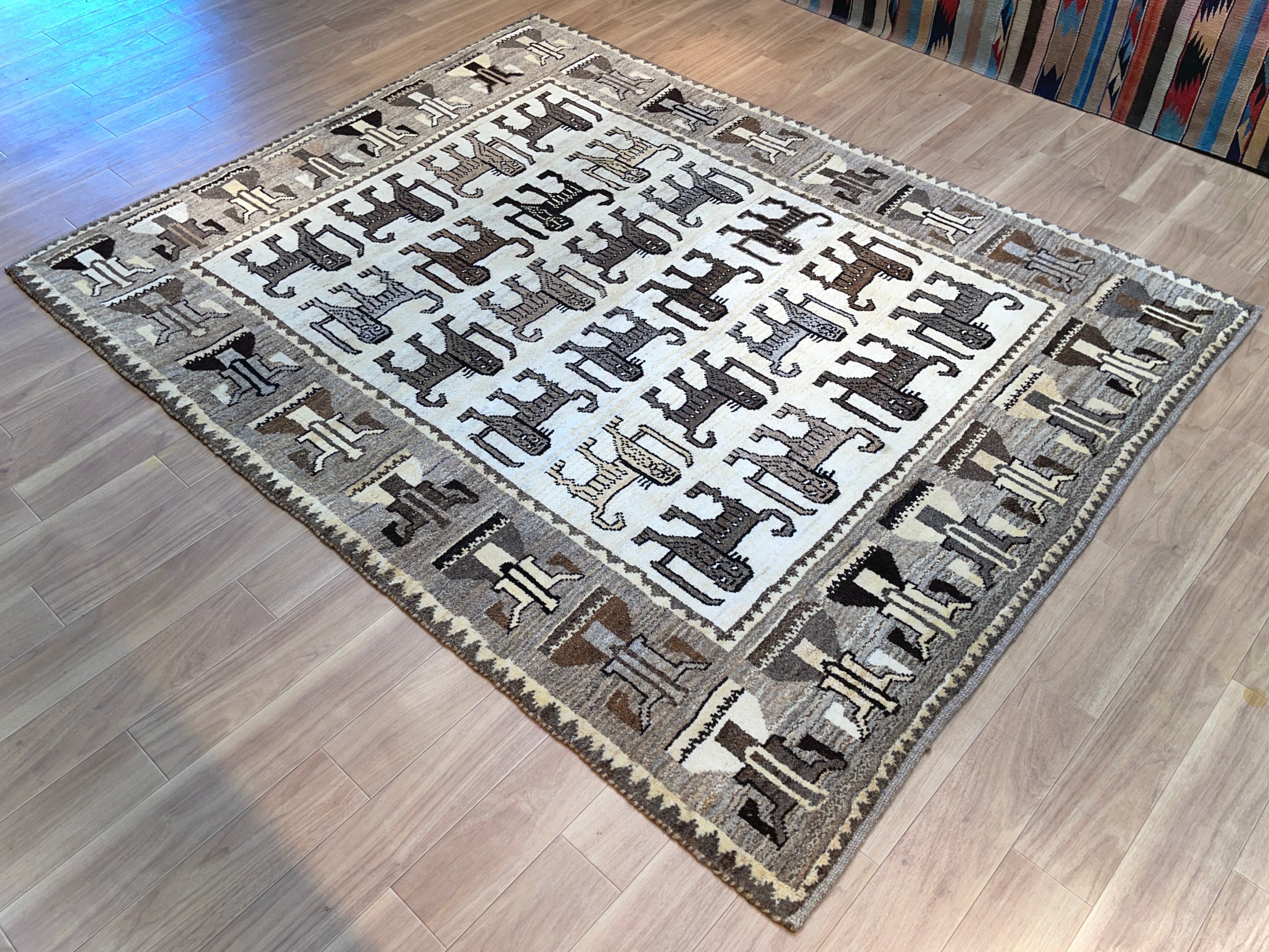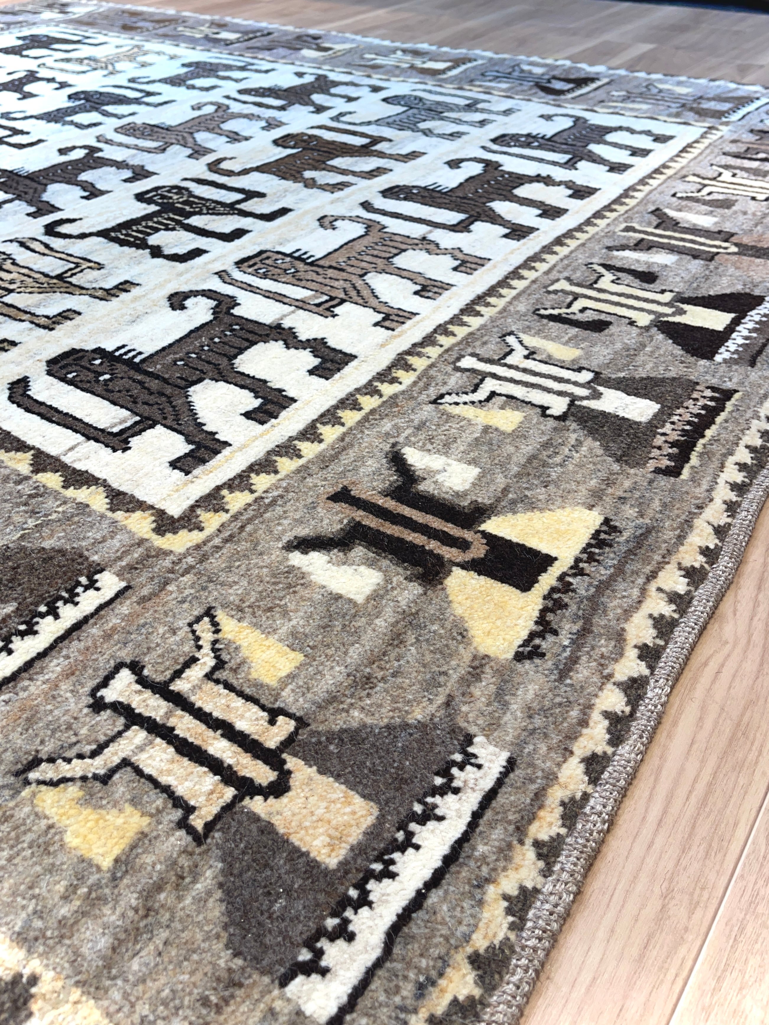 ペルシャにまつわる剣を持ったライオンと、カシュガイ族の「ハンカチの踊り」が、フレーム一周にぐるりと描かれています。同モチーフの配列デザインですが、ライオンのお顔付きが一匹ずつ違うのがご愛嬌〜♪ 手織りならではの楽しさがあります。
